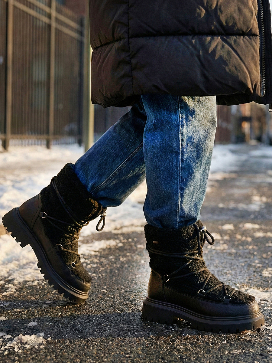 Duffy Nora Warm Water Resistant Boot kombinerer funksjon og stil i en moderne vinterstøvel. Overdelen er laget i robust syntetmateriale med en fin, matt overflate som tåler vær og vind. Innsiden er foret med mykt teddyfôr som gir lun varme, mens glidelåsen på siden gjør det enkelt å ta skoen av og på. Støvelen er utstyrt med vannavvisende membran som holder føttene tørre gjennom sesongen, samtidig som den sørger for pusteevne og komfort. Den kraftige yttersålen gir godt grep på vinterføre, perfekt for både bybruk og turer i kaldt vær.