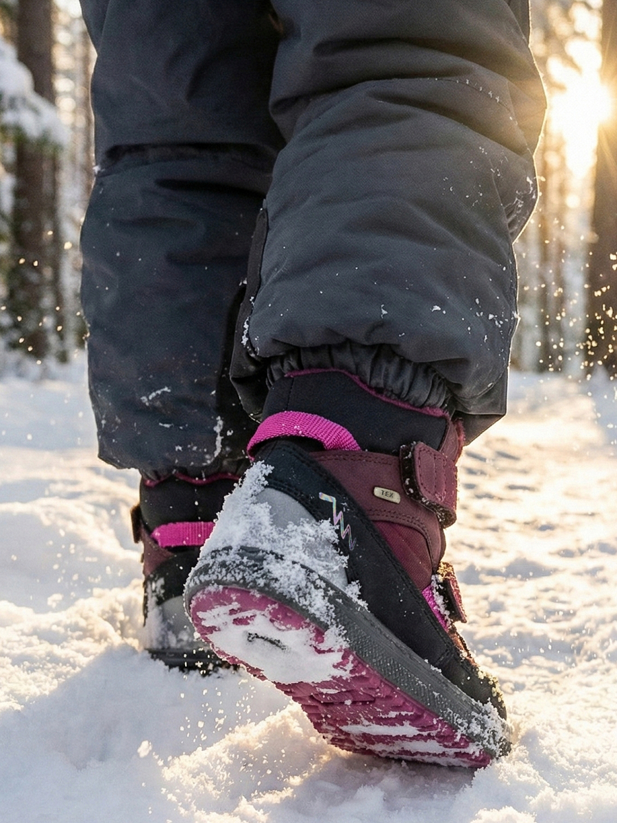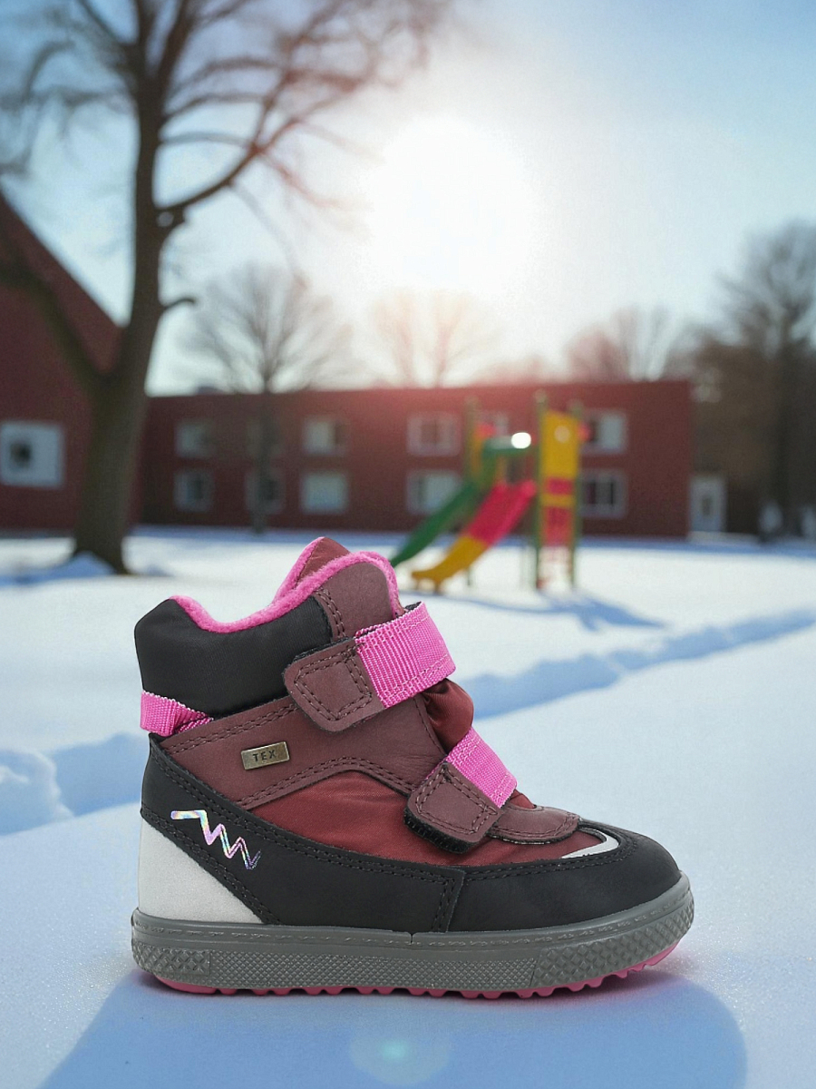Novi Snow Boot Mini i rosa og burgunder er en varm og slitesterk vintersko til de minste. Skoen er laget i en kombinasjon av mykt nubuckskinn og tekstil, med en vanntett TEX-membran som holder små føtter tørre i snø og slaps. Det myke fleecefôret gir god varme og komfort på kalde dager. Borrelåslukking gjør den enkel å ta av og på, samtidig som passformen kan justeres. Den fleksible yttersålen i gummi gir godt grep på glatte underlag, mens refleksdetaljer øker synligheten i mørket. En stødig og komfortabel vintersko som tåler aktiv lek i vintervær.