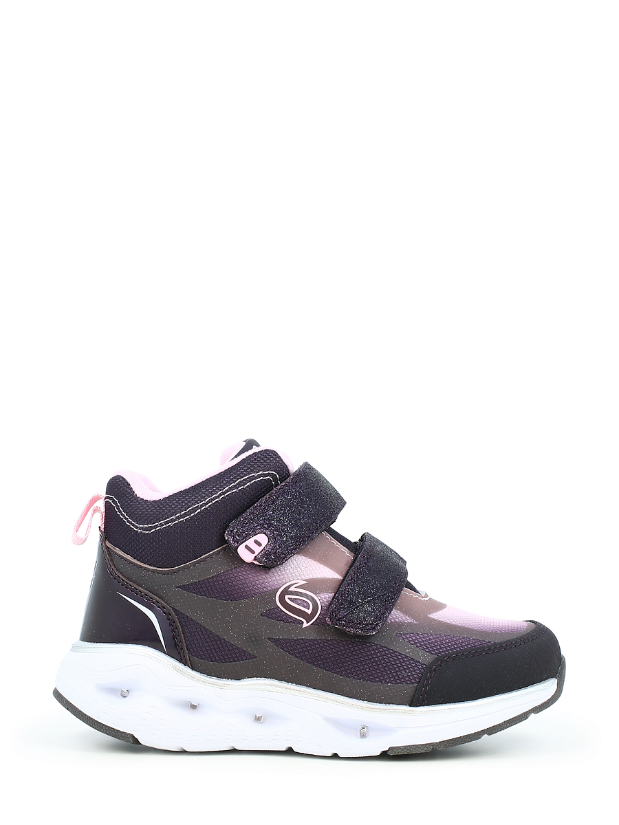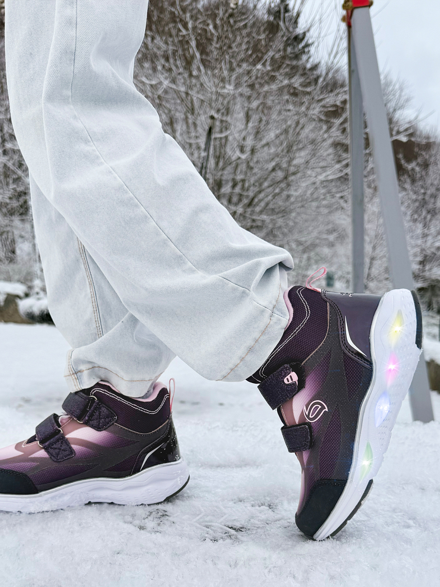Leaf Magra er en sporty og praktisk mellomhøy sko for barn, designet for aktive dager med både komfort og moro. Overdelen er laget i en kombinasjon av nylon, polyuretan og gummi, som gir slitestyrke og beskyttelse. Innsiden er fôret med myk fleece som holder føttene varme, mens tåhetten i gummi gir ekstra styrke mot slitasje. Den doble borrelåslukkingen gjør skoene enkle å ta av og på selv, og de morsomme blinkende lysene gir en leken detalj som barna vil elske.