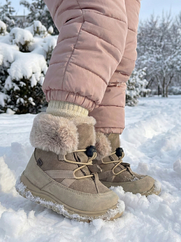 Overdelen er laget i vannavvisende materiale med glitterfinish, mens det myke foret på innsiden holder føttene komfortabelt varme. Den solide yttersålen i gummi gir godt grep på snø og is, og den høye modellen beskytter ankelen og hindrer at snø og fukt trenger inn.