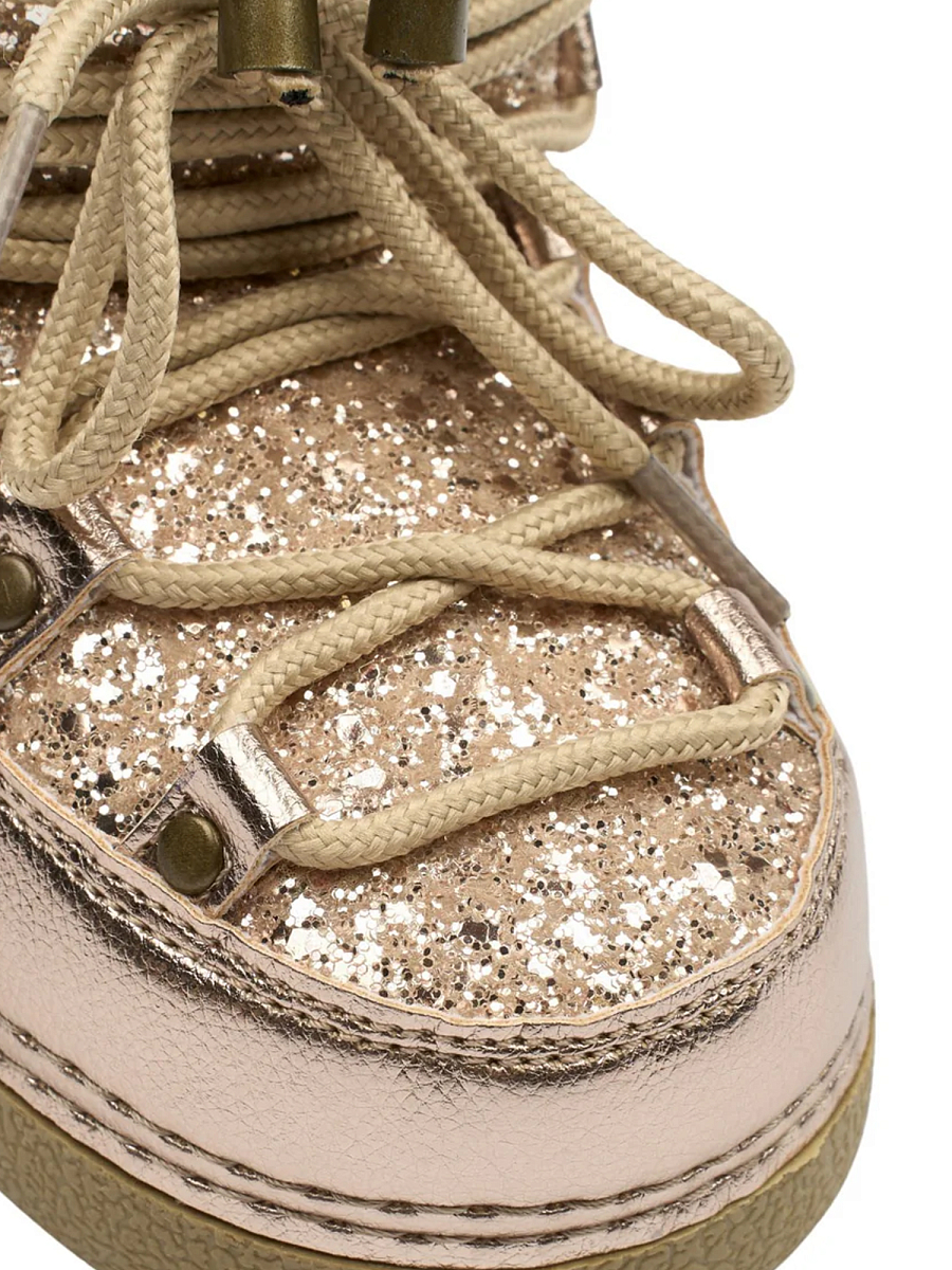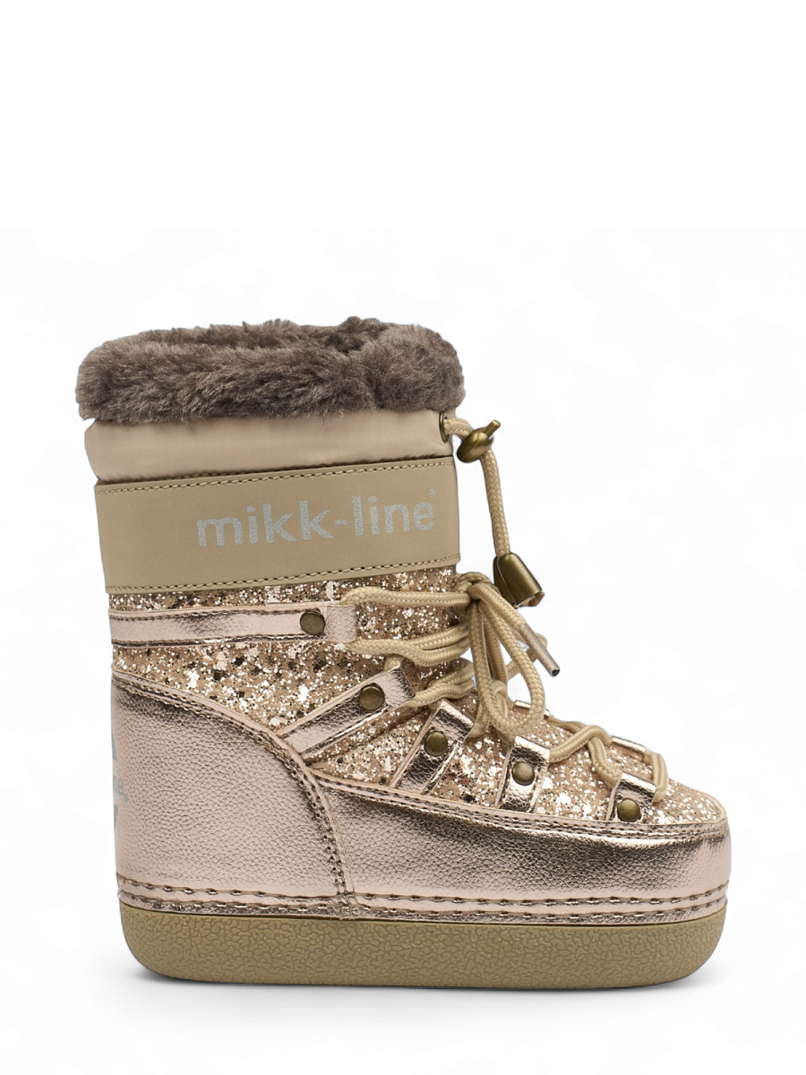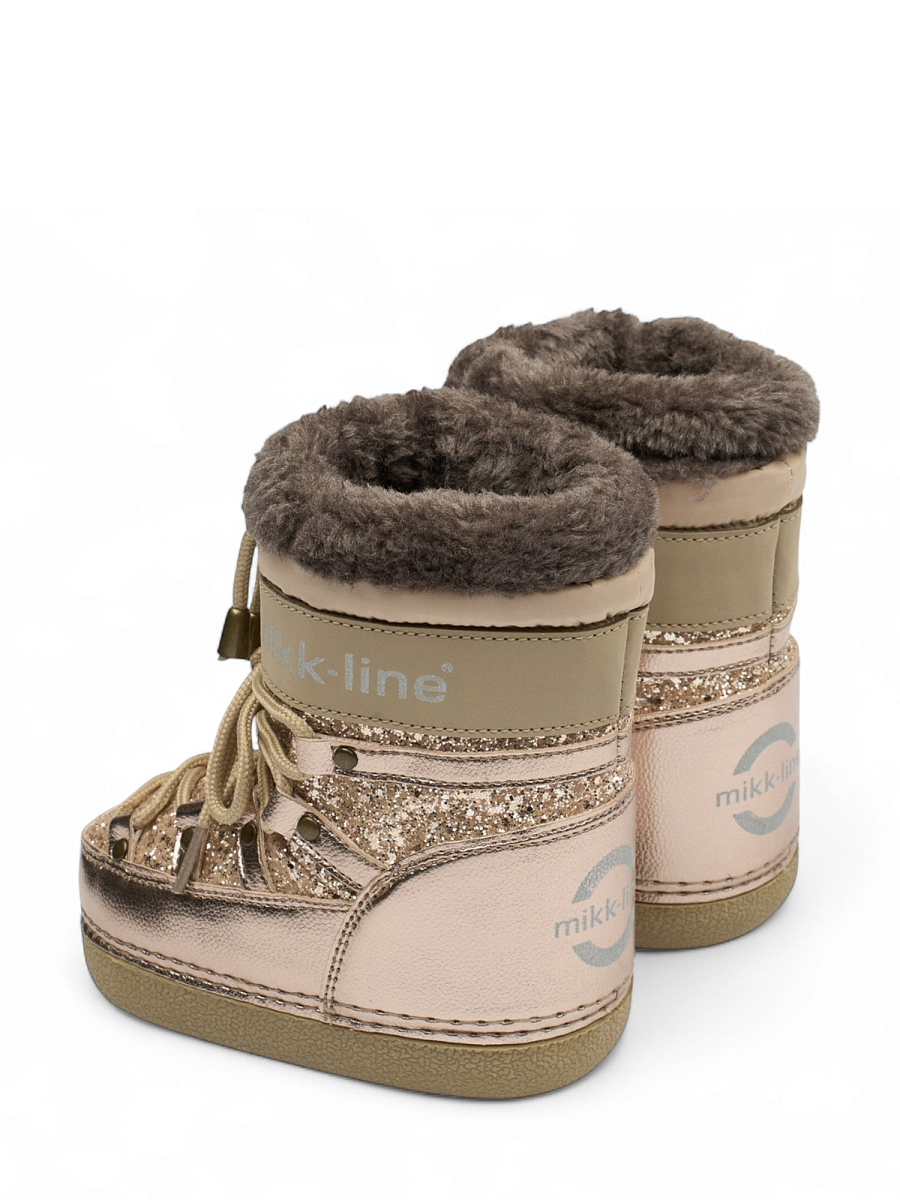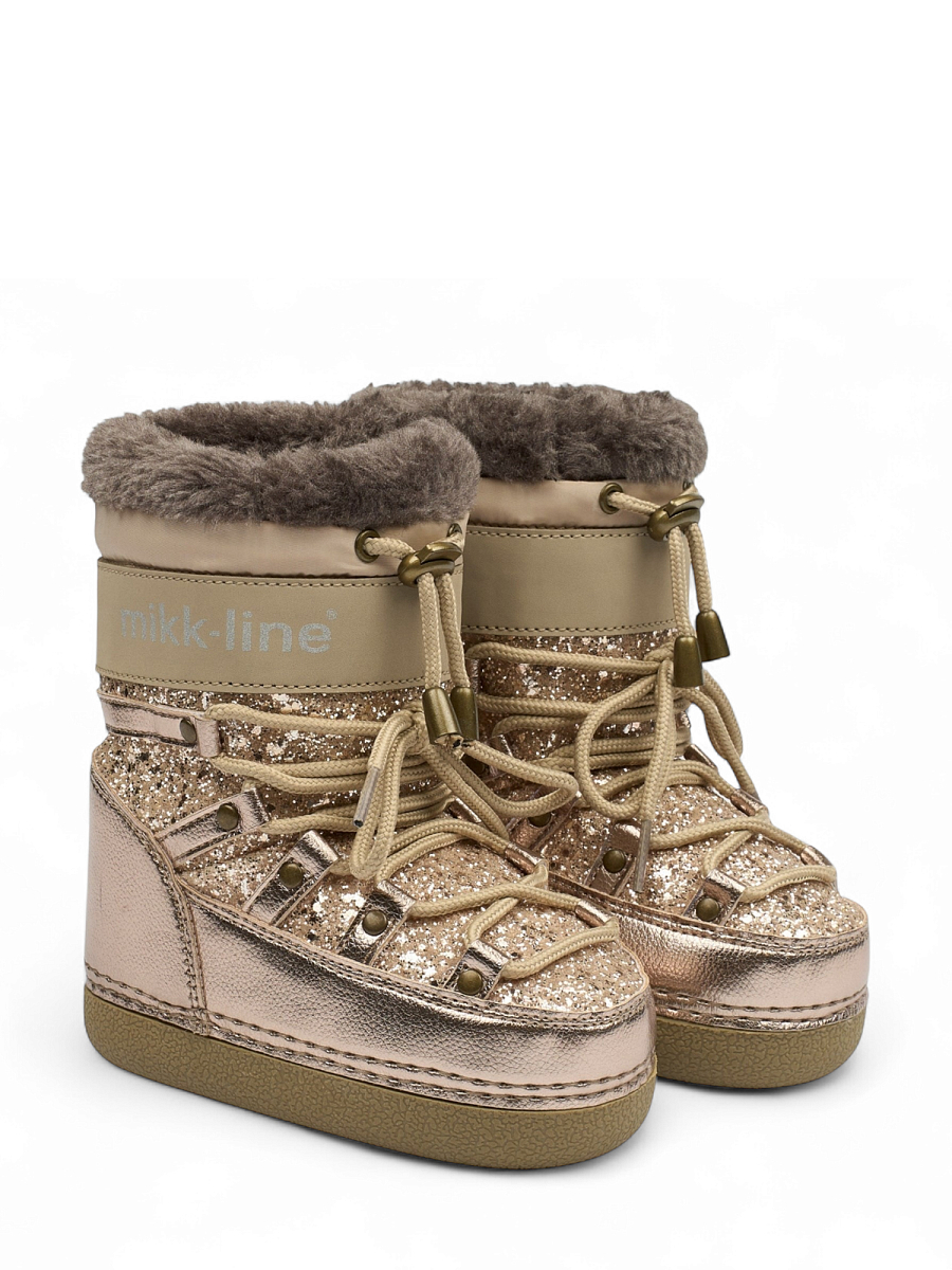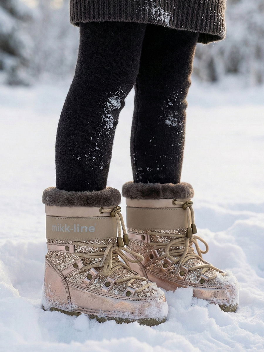Mikk-Line Snow Boot Glitter Champagne er en varm og praktisk vintersko for barn, laget for å takle kalde og våte vinterdager. Den glitrende champagnefargen gir et lekent og stilfullt preg, samtidig som skoen er bygget for å være funksjonell og slitesterk.