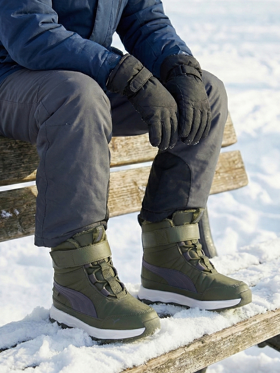 PUMA Evolve Boot Puretex AC 392649-04 er smarte vintersko designet for barn. Disse støvlene fra PUMA er laget i en robust og vannavstøtende konstruksjon, ideell for vinterens utfordringer. Den mørkegrønne fargen kombinert med subtile grå detaljer gir et stilig utseende, mens de justerbare borrelåsremmene sørger for en enkel og sikker passform. Bootsene har en slitesterk såle som gir utmerket grep og stabilitet på glatte overflater, noe som gjør dem perfekte for lek og eventyr i kaldt vær. Med PUMAs velkjente kvalitet og design er disse støvlene både praktiske og trendy for aktive barn.