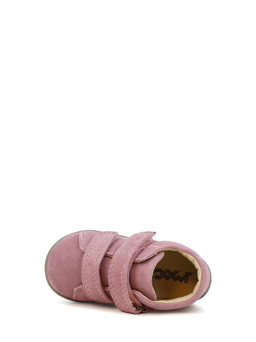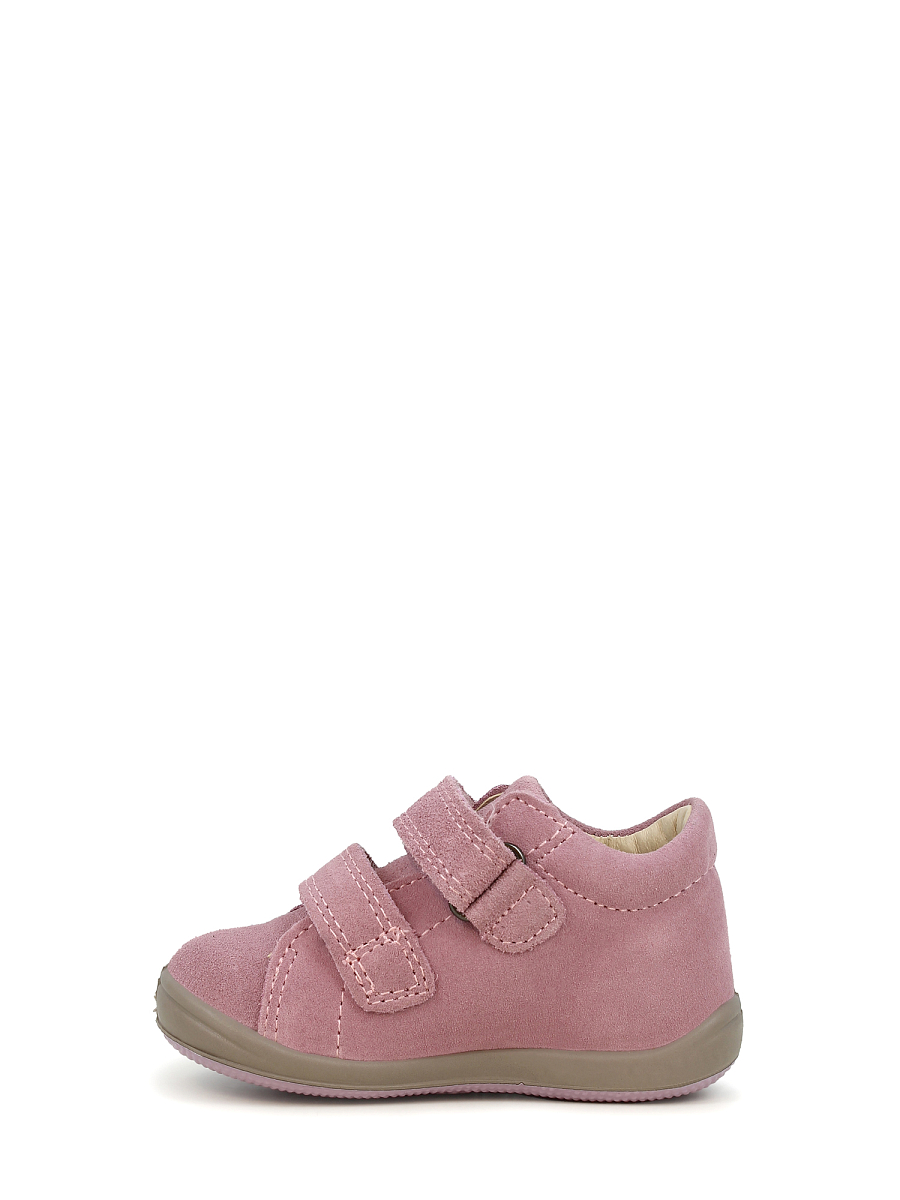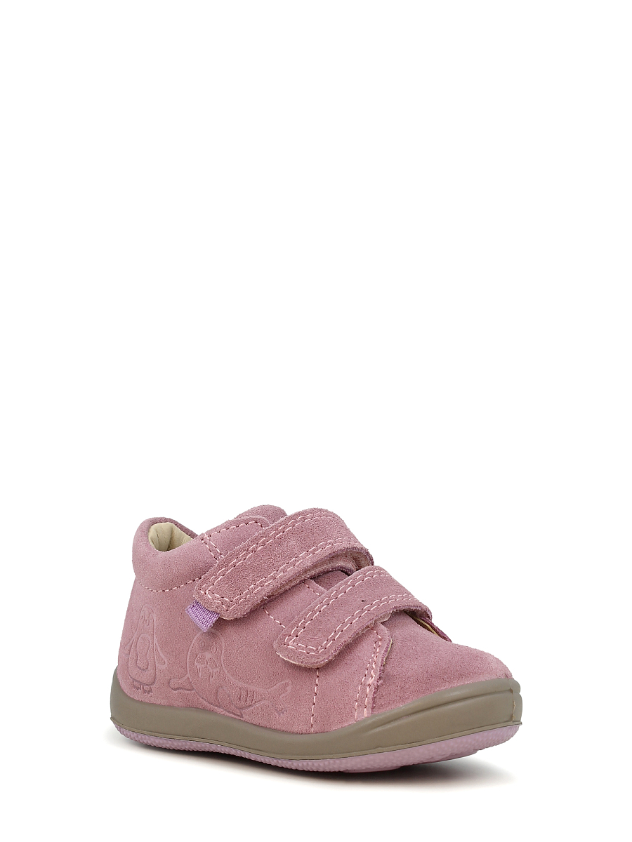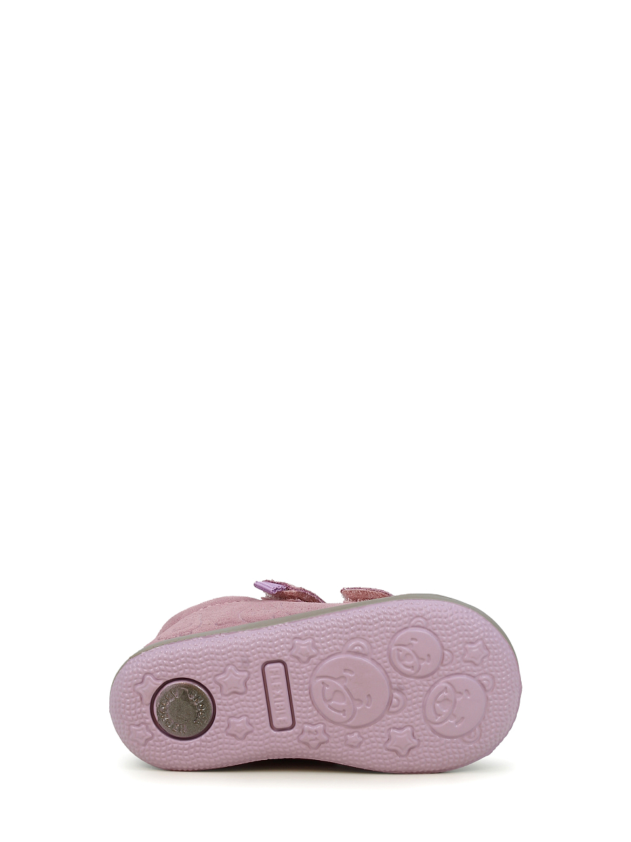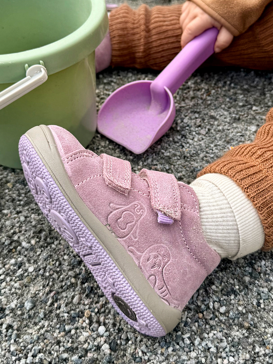 Denne myke babyskoen i nubuk skinn er laget for å gi små føtter komfort og støtte i de første skrittene. Skoen har en fleksibel gummisåle som følger barnets bevegelser, og en skinn dekksåle på innsiden som gir ekstra komfort. Den lukkes enkelt med praktiske borrelåser, som også sørger for en stabil passform. Skoen har et søtt mønster på siden med dyr, og den dus rosa fargen gjør den enkel å matche med enhver garderobe. En kombinasjon av mykhet, støtte og funksjonalitet som passer perfekt til aktive småbarn.