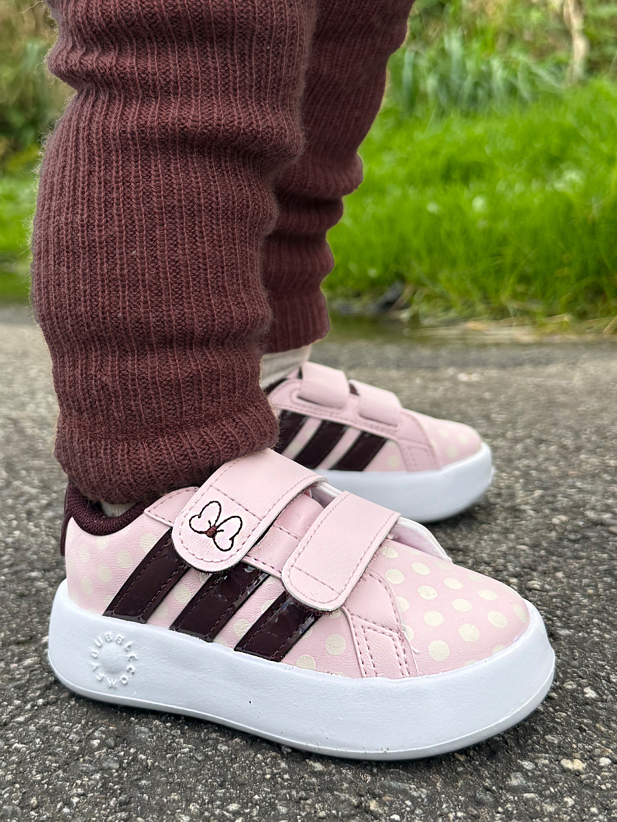 adidas x Disney Minnie Mouse Grand Court kombinerer klassisk adidas-design med barnas favorittfigur – Minnie Mouse. Disse rosa skoene for de minste har en søt 3D-sløyfe bakpå hælen og fargeglade detaljer som gir et lekent uttrykk. Den slitesterke overdelen i syntetisk materiale tåler aktiv bruk, mens mykt fôr og en fleksibel EVA-såle sørger for komfort hele dagen. To praktiske borrelåsstropper gjør dem enkle å ta av og på – perfekt for små hender og hektiske morgener.