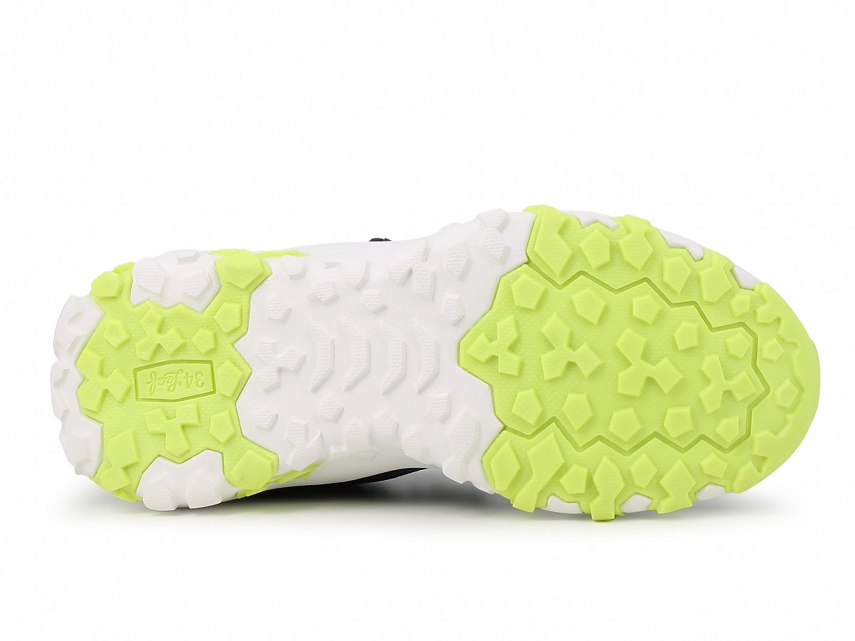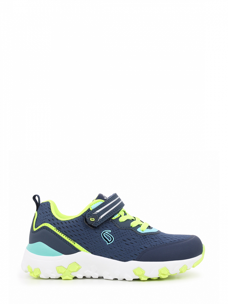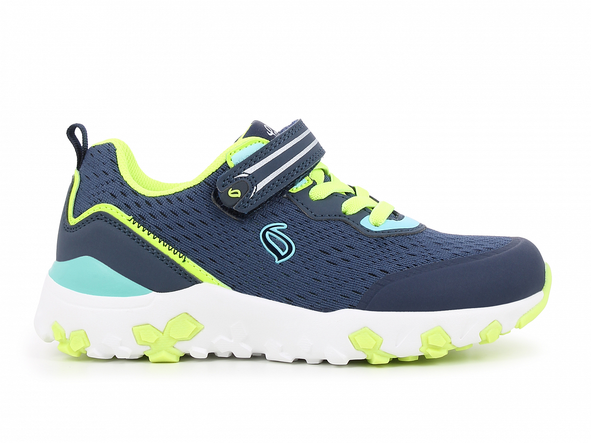 Kul og sporty barnesneaker fra Leaf i en kombinasjon av mesh og PU. Skoen har borrelås og strikklisser slik at den er lett å få på og tilbehagelig å gå med. Den har en flott material- og fargemix i navy, hvit, lys blå med detaljger i gul og foret med gult mesh for. Den har en uttakbar tekstil-dekksåle. Yttersålen er en blanding av Phylon og TPR og den har støtabsorberende egenskaper.