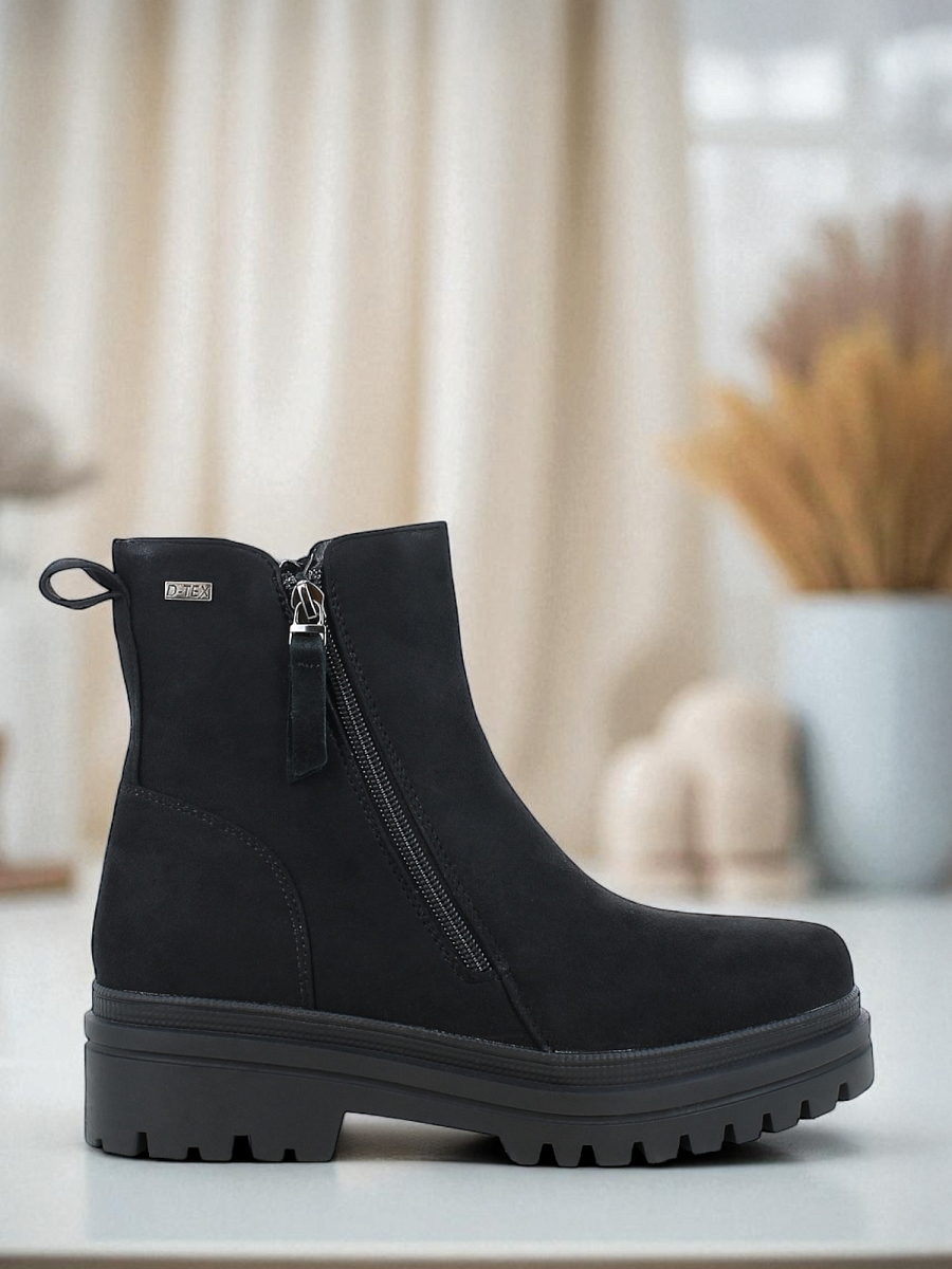 Boots med indre og ytre glidelås for enkel av og på. Overdel i semsket imitert skinn med vannavvisende D-tex membran. Gummisåle, behagelig passform og fleecefôr.