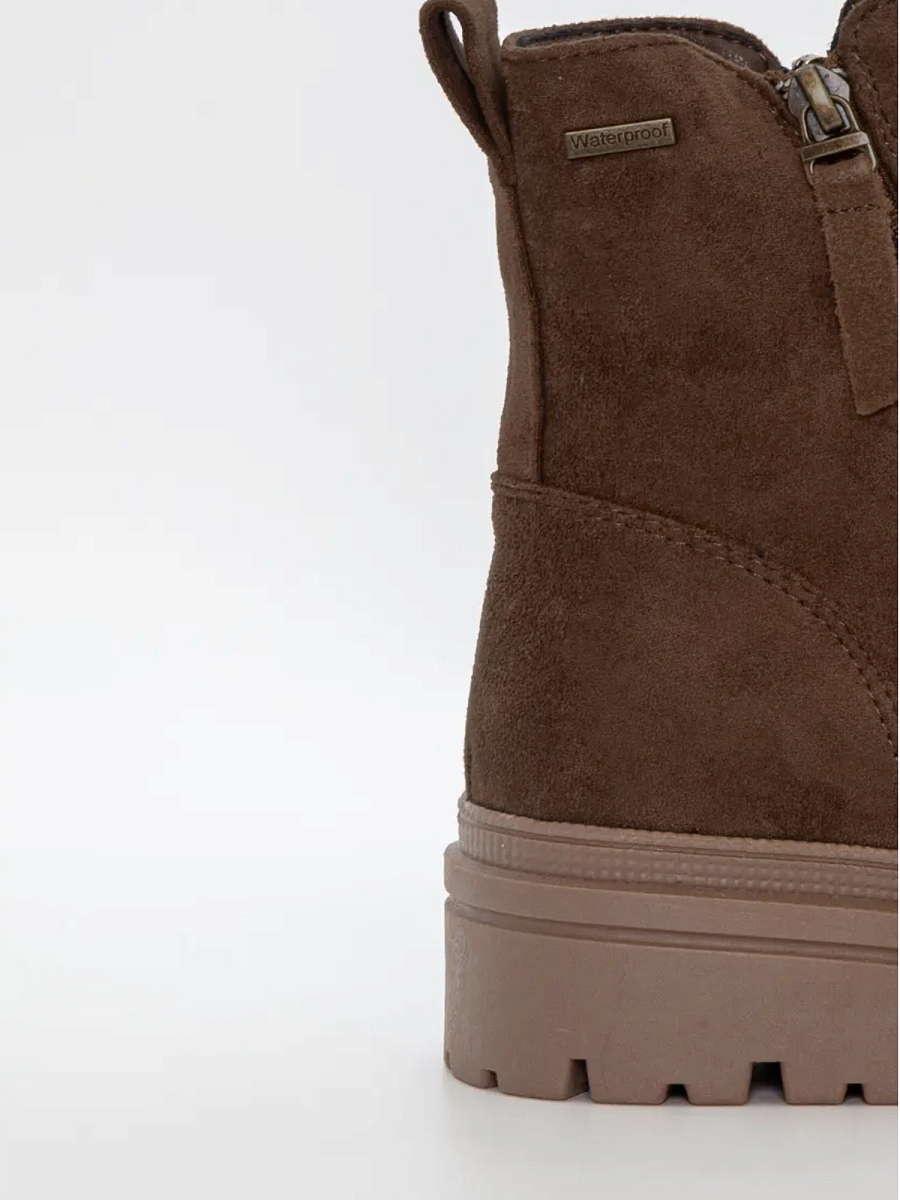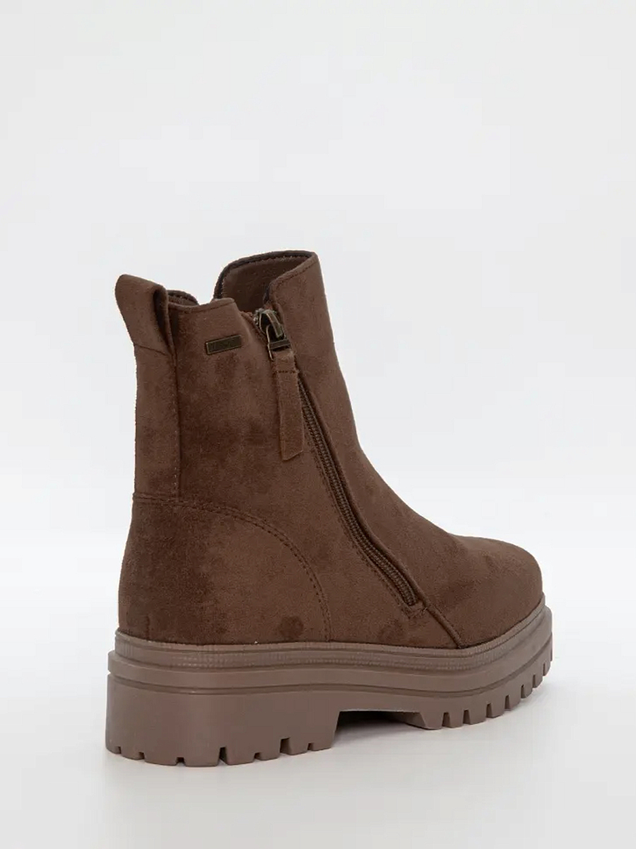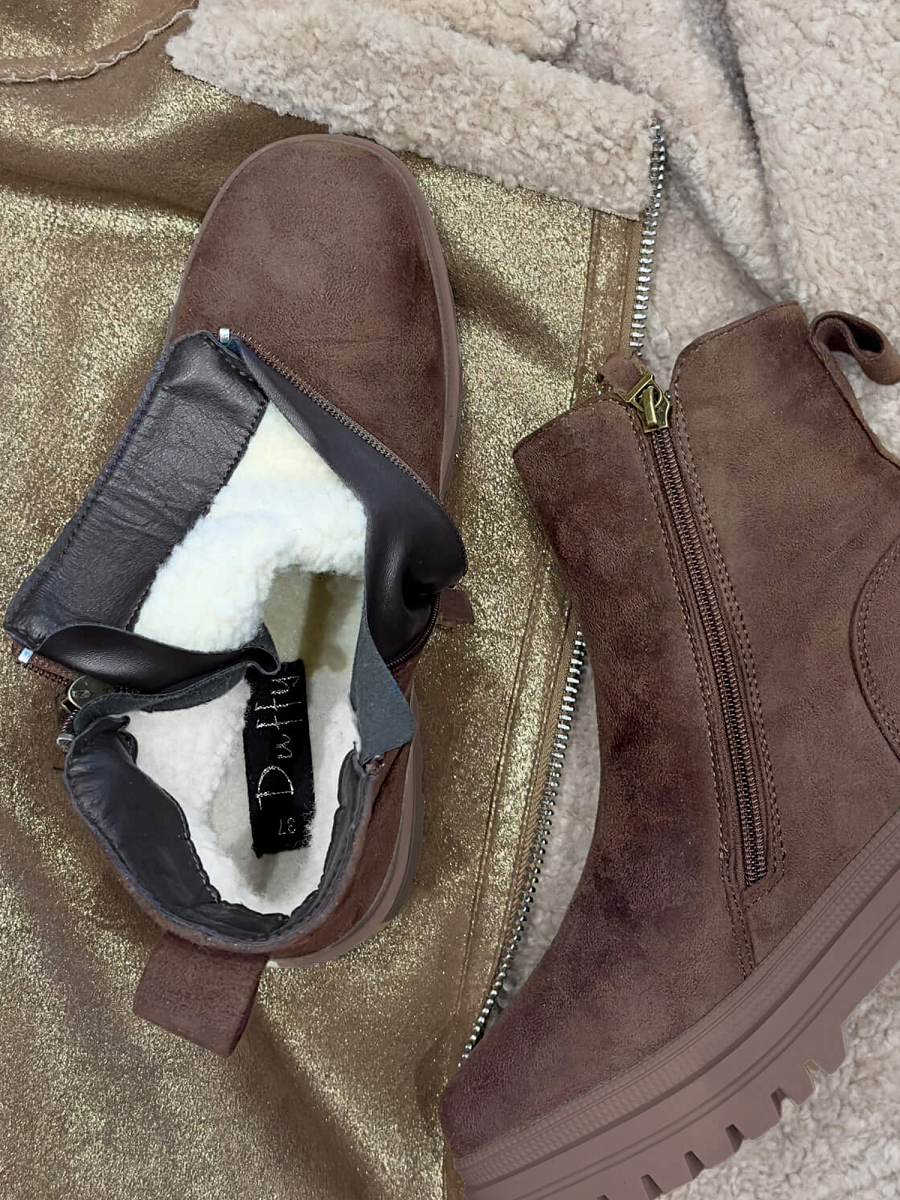 Disse bootsene har både en indre og ytre glidelås som gjør dem enkle å ta av og på. Overdelen er laget av vannavstøtende semsket imitert skinn med en D-tex membran som beskytter mot fuktighet. De har en gummisåle for godt grep, en behagelig passform og fleecefôr som gir ekstra varme. Bootsene er i tillegg utstyrt med en patentert anti-skli hældel for bedre stabilitet på glatt underlag, noe som gjør dem ideelle for vinterforhold.