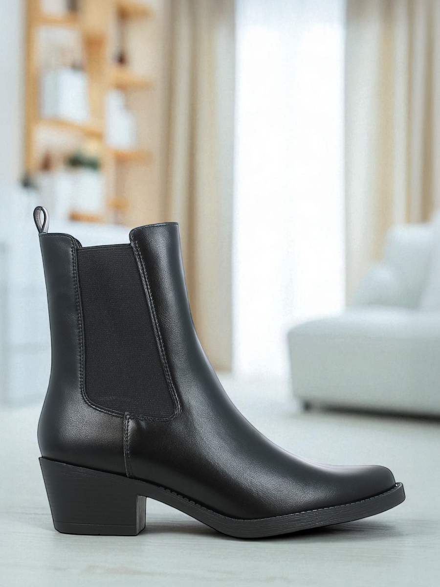 Trendy boots med spiss tå som gir en westerninspirert look. Støvlene har en myk og behagelig hæl for høy komfort. Elastikk på sidene for enkel av og på. Hælen på disse støvlene er 5 cm.