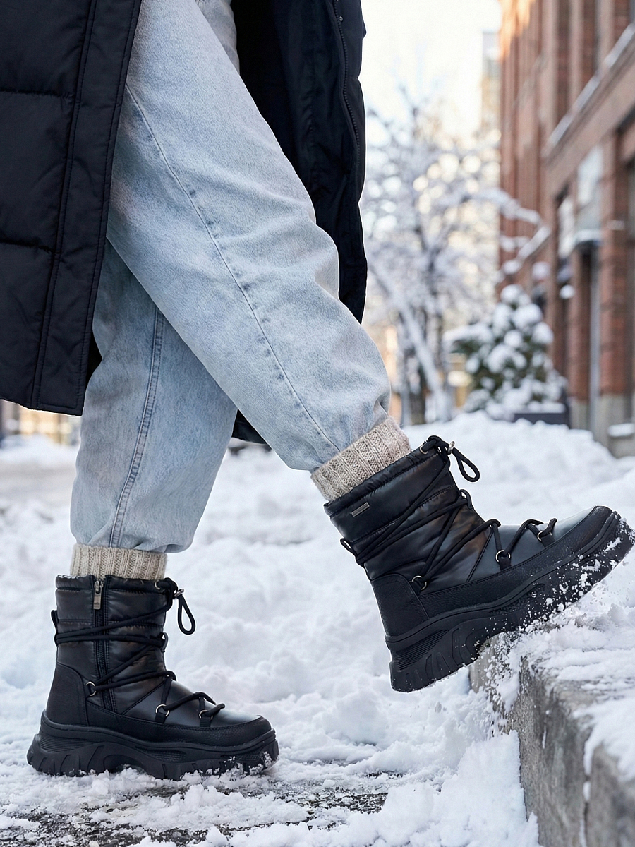 Hold føttene varme og stilige med disse kule vinterbootsene til dame! De har et sporty utseende med et blankt materiale og dekorative lisser på overdelen. Den praktiske glidelåsen på innsiden gjør det enkelt å ta skoene av og på. Med *vanntett design og superdeilig varmfôr er disse skoene perfekte for kalde og våte vinterdager.