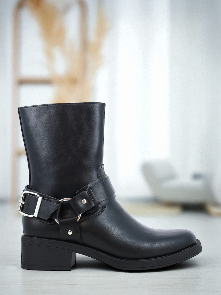 Biker Boots i sort skinn med litt røffere såle og fine sølvdetaljer på utsiden og glidelås på innsiden. Biker boots er et must i høstgarderoben! Hælhøyden på disse støvlene er behagelige 4 cm og skafthøyden er 18 cm..