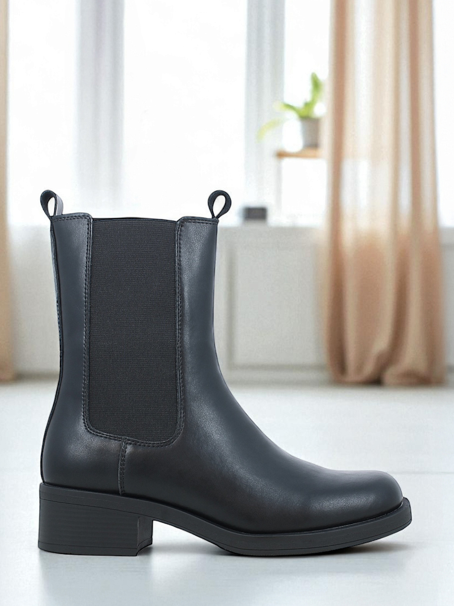 Klassiske boots i skinnimitasjon med grovere såle og strikk på sidene. Disse bootsene kombinerer stil og funksjon, noe som gjør dem til et perfekt valg for høstgarderoben din! Hælhøyden er behagelige 4 cm, mens skafthøyden måler 18 cm.