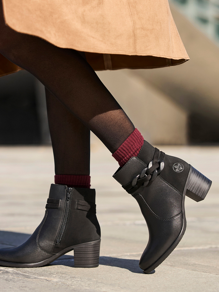 Rieker Amara Ankle Boot er en elegant svart ankelstøvlett som kombinerer moderne design med høy komfort. Overdelen er laget i en kombinasjon av lær og syntetisk materiale, dekorert med en stilig kjettingdetalj rundt ankelen som gir et eksklusivt preg. En praktisk glidelås på innsiden gjør skoen enkel å ta av og på, mens den stabile blokkhælen på 5,5 cm gir et trygt og behagelig steg hele dagen. Tekstilfôr og Riekers kjente Antistress-teknologi sørger for letthet, fleksibilitet og god støtdemping. Med normal skobredde (G) og lav skaftlengde på 11–15 cm får du en sko som passer til mange anledninger.