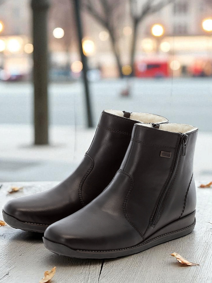 Klassisk og varmfôret ankelstøvlett i sort skinn med glidelås på begge sider. Vannavvisende Tex-membran.