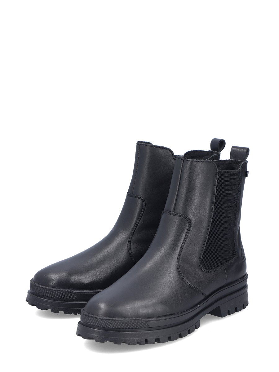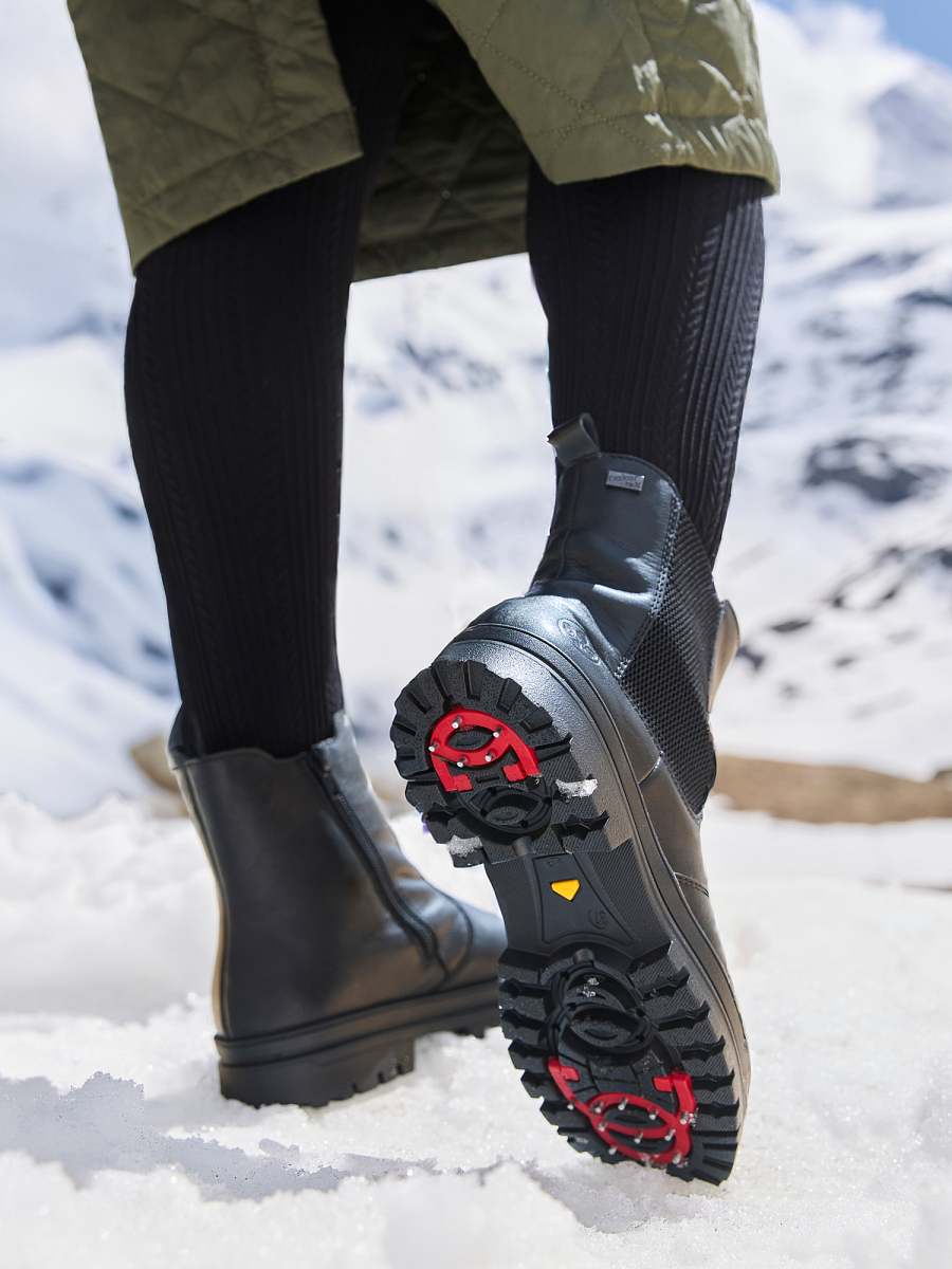 Chelsea med utfellbare brodder er en elegant og funksjonell ankelstøvlett for kvinner som kombinerer moderne design med praktiske vinteregenskaper. Modellen er laget i svart skinn med elastiske sidepaneler som gir god fleksibilitet og passform, mens den innvendige glidelåsen gjør det enkelt å ta skoene av og på. Innsiden er foret med myk tekstil som holder føttene varme på kalde dager, og den uttakbare innersålen gir ekstra komfort og enkel rengjøring. Takket være RiekerTEX-membranen er skoen vannavvisende og pustende, slik at føttene holder seg tørre i all slags vær. Yttersålen er utstyrt med Rieker Grip-system med utfellbare brodder, som sikrer trygt grep på glatte og isete underlag – ideelt for norske vinterforhold.