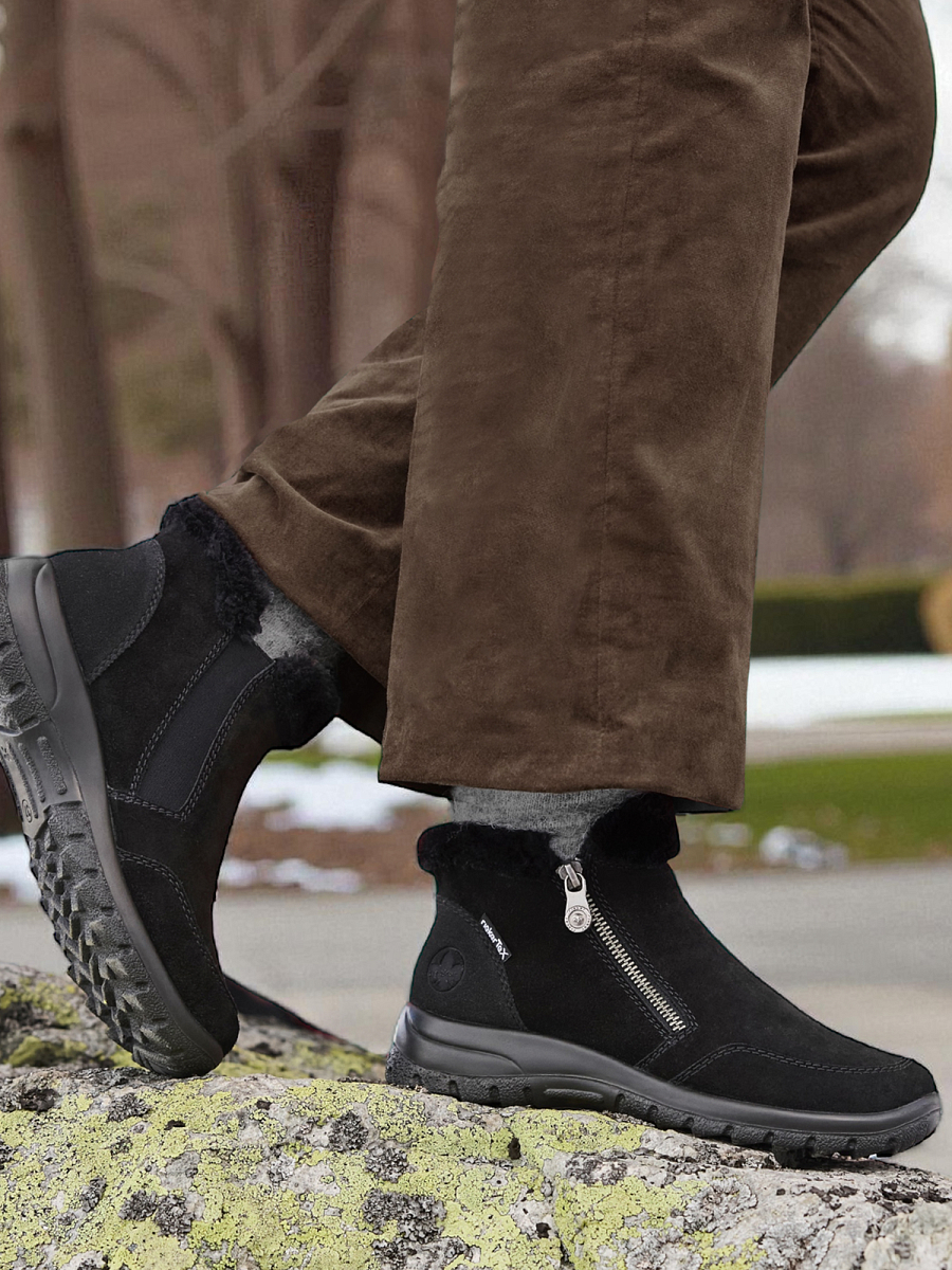Materiale: Overdel i semsket skinn, innside i tekstil, varmt fôr med RiekerTEX-membran, PU-yttersåle