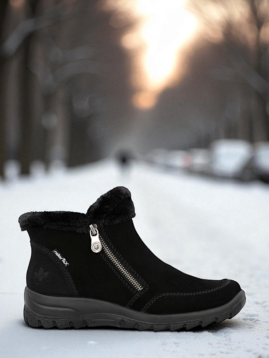 Rieker Støvlett Elara er en sort ankelstøvlett i semsket skinn, designet for både komfort og stil på kalde dager. Den praktiske glidelåsen gjør skoen enkel å ta av og på, mens den myke kragen i tekstil gir et moderne uttrykk. Modellen er utstyrt med vannavvisende RiekerTEX-membran og varmt fôr, som holder føttene tørre og behagelige gjennom vinteren. Den lette PU-sålen er støtdempende og gir en stabil og komfortabel gange, mens den lave hælen på 39 mm gir et feminint preg uten å gå på bekostning av komfort.