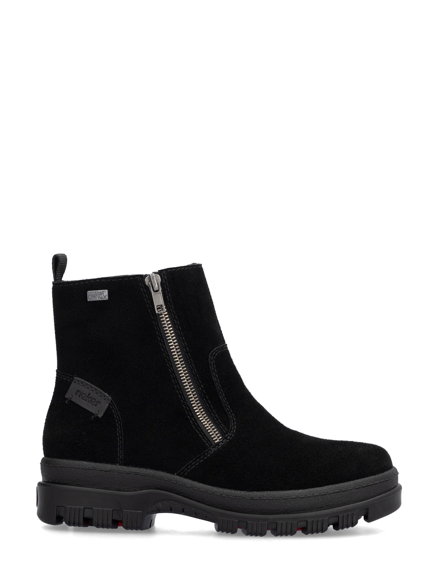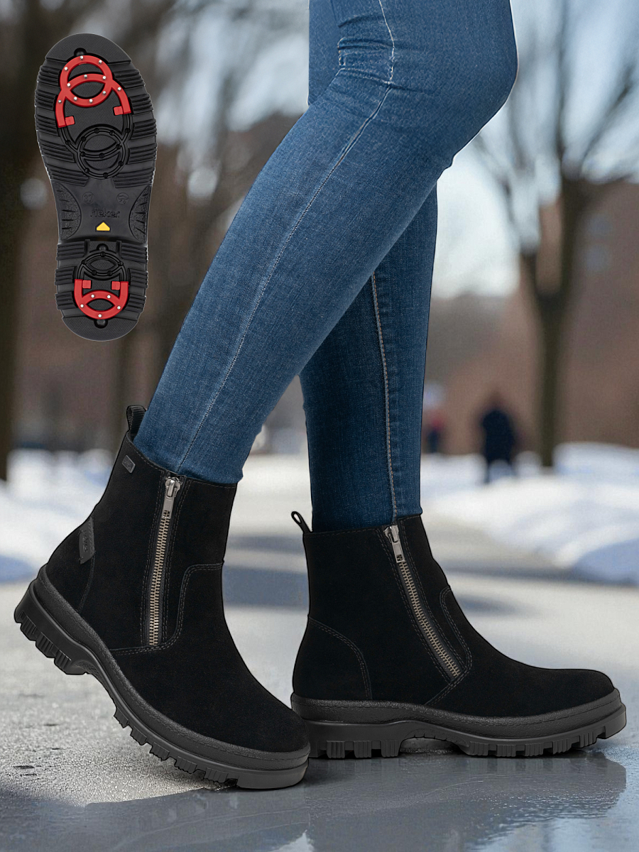 Rieker Lenera kombinerer elegant design med funksjonell komfort – perfekt for kalde dager. Overdelen er laget av mykt sort semsket skinn som gir et raffinert uttrykk samtidig som det beskytter mot vær og vind. Den praktiske glidelåsen gjør det enkelt å ta skoen av og på, mens den solide yttersålen med godt grep sørger for stabilitet på glatte underlag. Med sterkt vannavvisende RiekerTEX-membran og Flip-Grip-teknologi med utfellbare brodder står du støtt selv på is og snø. Den myke, varme innersiden holder føttene komfortable gjennom hele dagen, og den uttakbare innersålen gir ekstra fleksibilitet og hygiene.