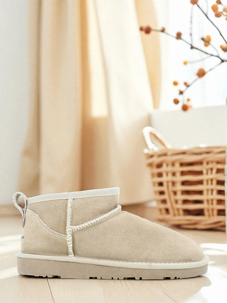 Disse trendy lave ugg-stil bootsene i semsket skinn kombinerer stil og funksjonalitet. Med en overdel i ekte semsket skinn og synlige sømmer, får de et sporty og moderne uttrykk. Bootsene er fôret med et mykt teddyfôr i en ullblanding (60 % ull), noe som gir varme og komfort i kaldt vær. Den flate gummisålen har mønster for ekstra godt grep på underlaget.