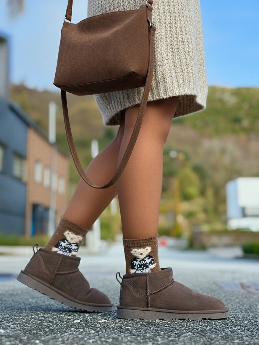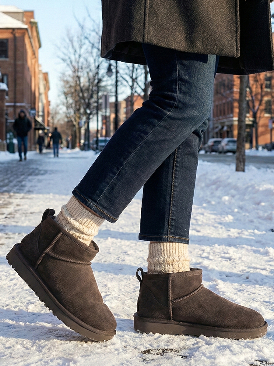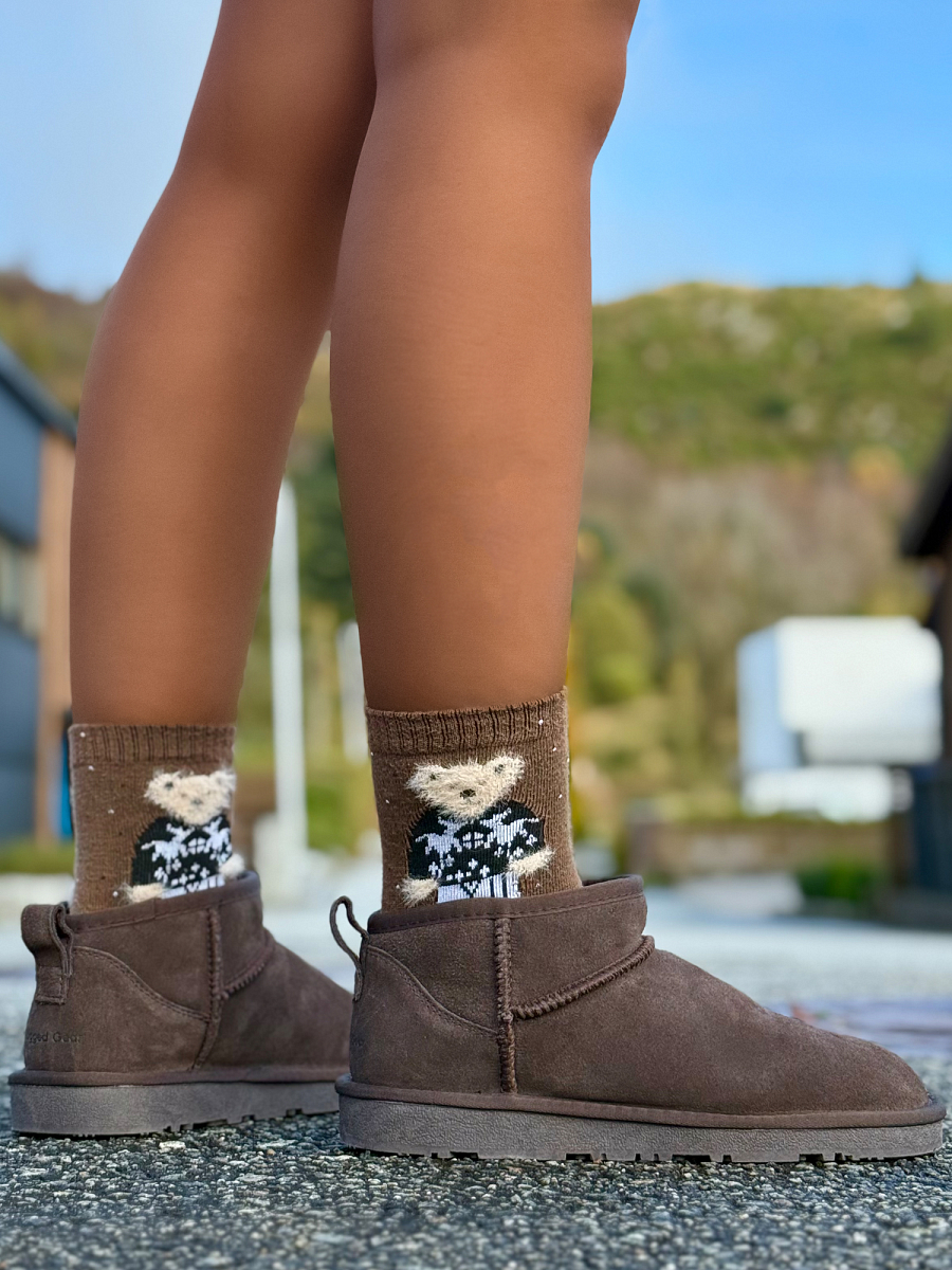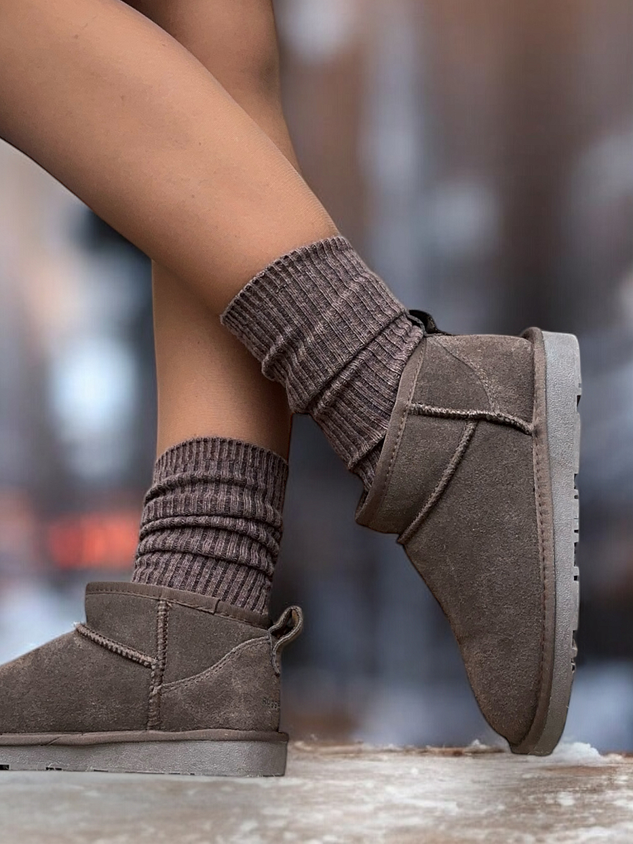 Disse trendy lave ugg-stil bootsene i semsket skinn kombinerer stil og funksjonalitet. Med en overdel i ekte semsket skinn og synlige sømmer, får de et sporty og moderne uttrykk. Bootsene er fôret med et mykt teddyfôr i en ullblanding (60 % ull), noe som gir varme og komfort i kaldt vær. Den flate gummisålen har mønster for ekstra godt grep på underlaget.