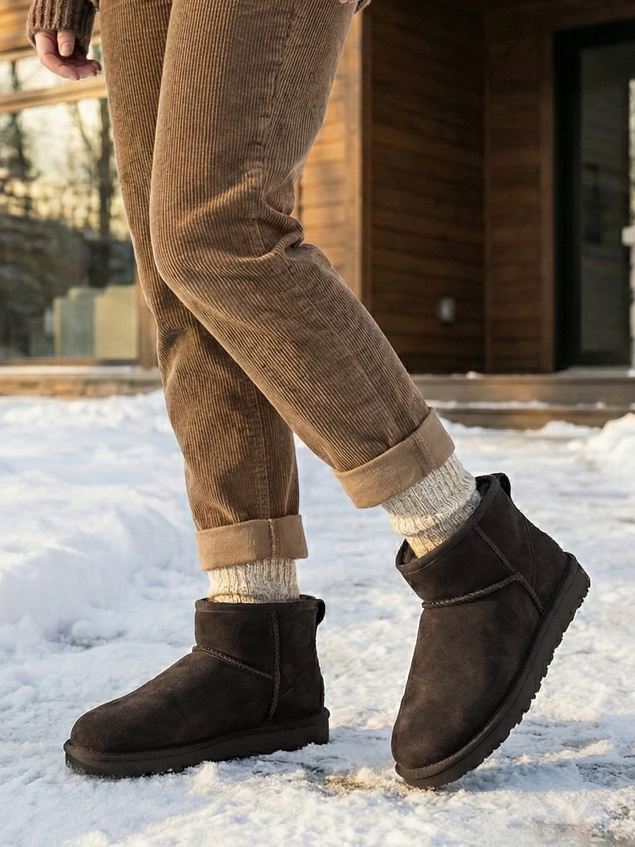 Disse bootsene i ugg-stil er både kule og comfy! Med ekte semsket skinn og synlige sømmer får de en sporty, fresh look. Innsiden er fôret med teddy i ullblanding (60 % ull), så du holder deg varm på kalde dager. Fargen er mørk brun, brunsort.