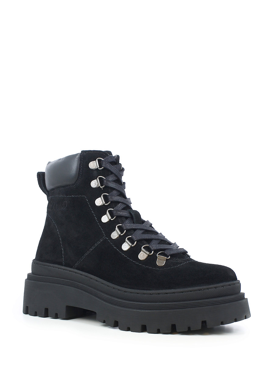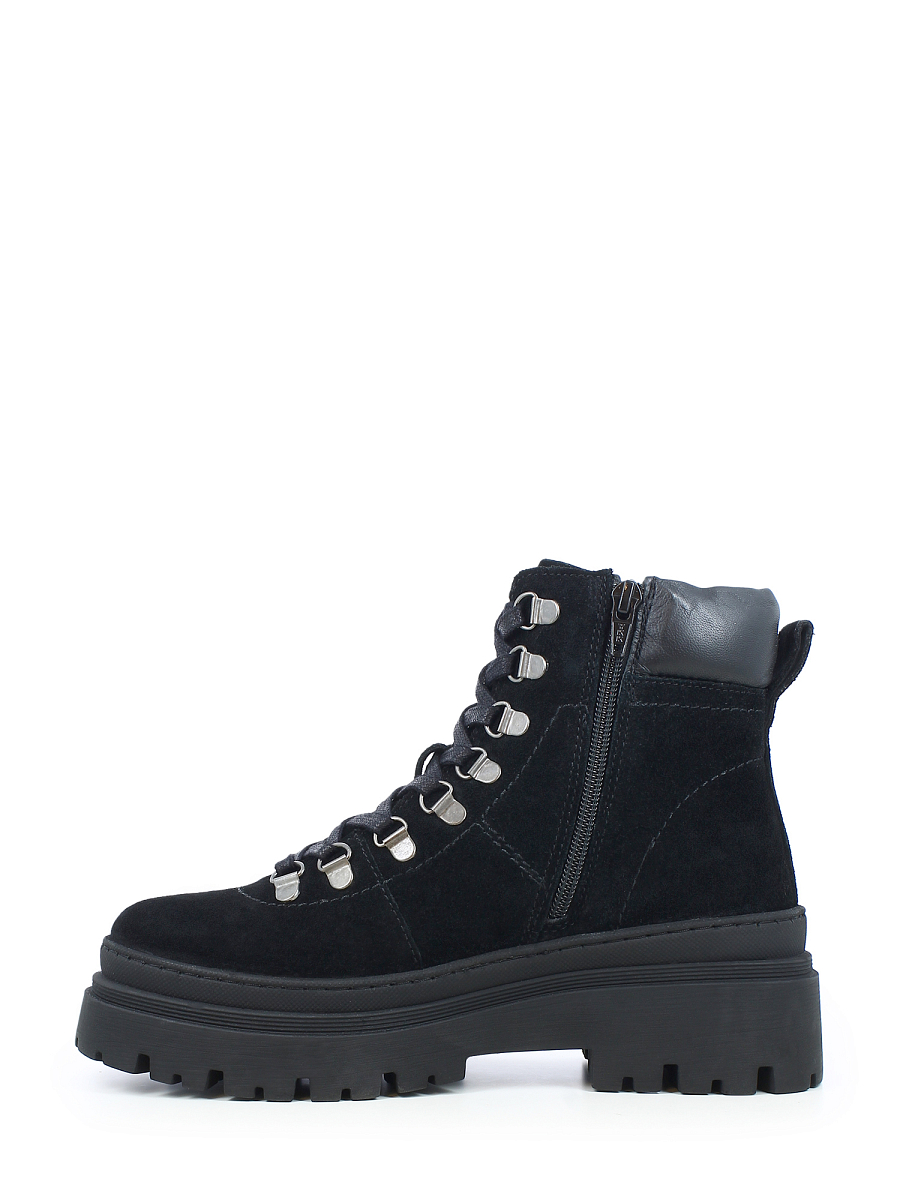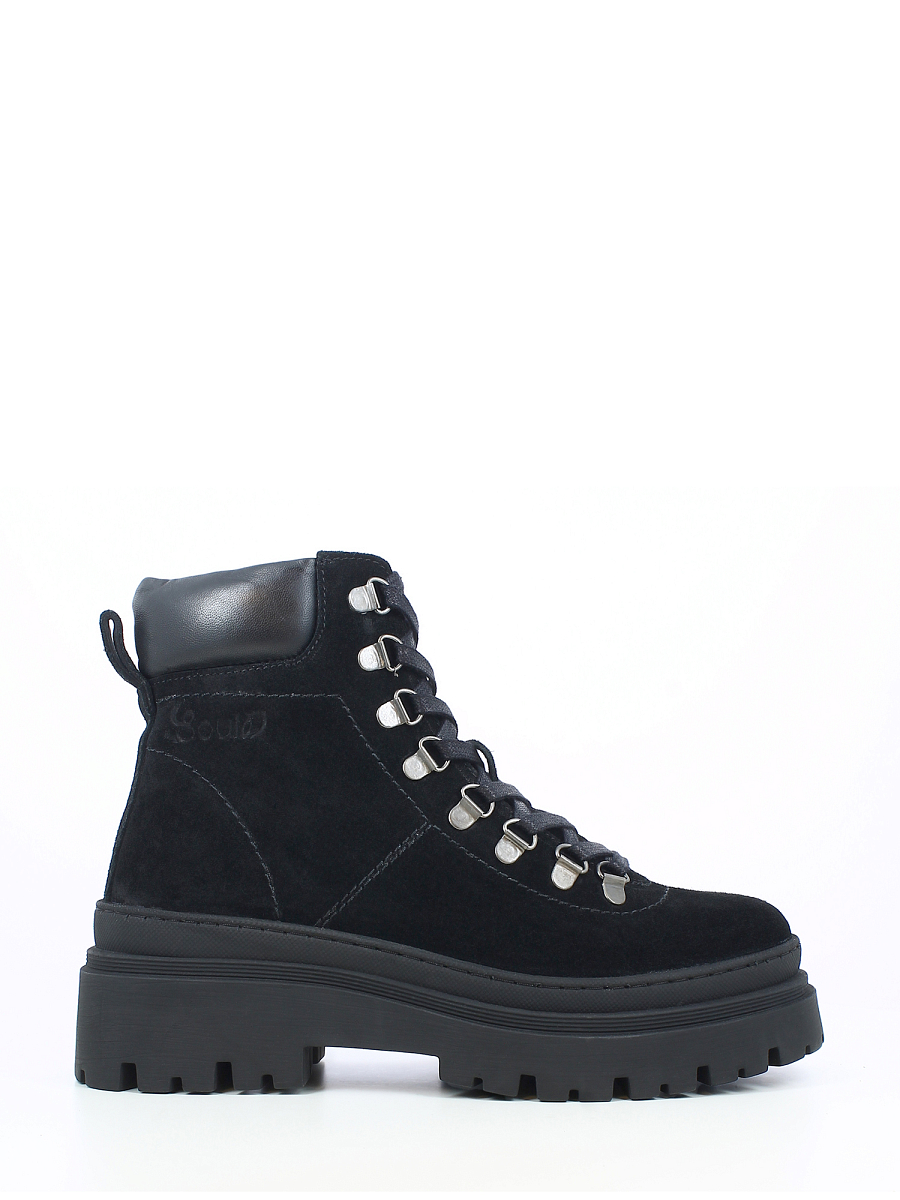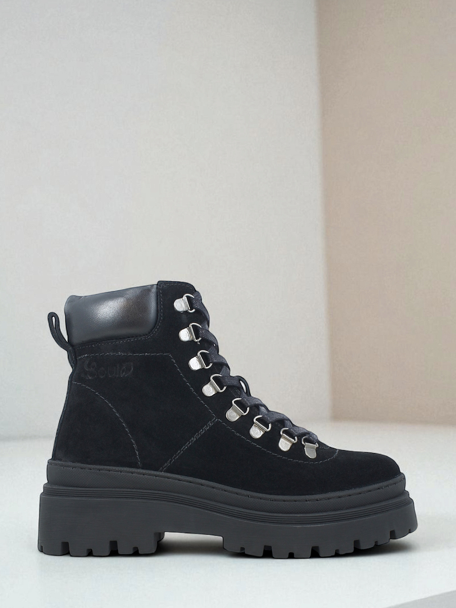 SoulD Arezzo Suede Boots Black er en eksklusiv og moderne snøreboots laget i mykt semsket skinn fra storfe. Den dype sorte fargen gir et tidløst uttrykk som passer perfekt både til hverdags og til mer pyntede antrekk. Modellen har robuste metallhemper og kraftige lisser som gir et elegant, men røft preg, kombinert med en funksjonell glidelås på innsiden for enkel av- og påtagning. Den polstrede skinndetaljen rundt ankelen gir ekstra komfort, mens den solide yttersålen med kraftig mønster sikrer godt grep og stabilitet på ulike underlag.