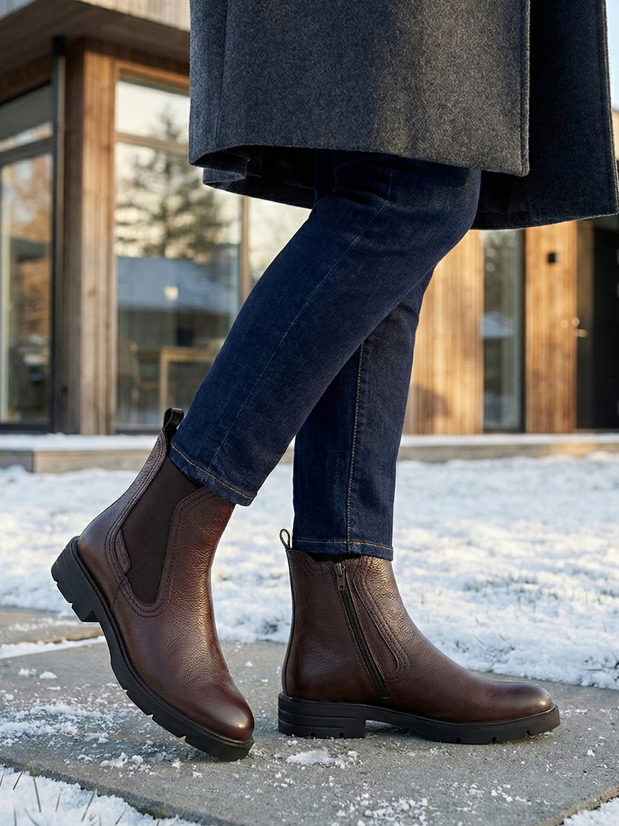 Tamaris Marbelle er en elegant ankelstøvlett laget i ekte narvskinn i en varm mocca-nyanse som gir et sofistikert og tidløst uttrykk. Den myke, isolerte innsiden holder føttene varme på kalde dager, mens den tekstilbaserte innersålen gir pusteevne og komfort gjennom hele dagen. Glidelåsen på innsiden gjør støvletten enkel å ta av og på, og de elastiske sidepanelene sørger for fleksibilitet og en behagelig passform. Den solide yttersålen med lav hæl på 3,5 cm gir godt grep og stabilitet, perfekt for både byliv og hverdagsbruk. Med sitt enkle, rene design og kvalitetsmaterialer er Tamaris Marbelle et stilfullt valg som kombinerer komfort og klassisk uttrykk.