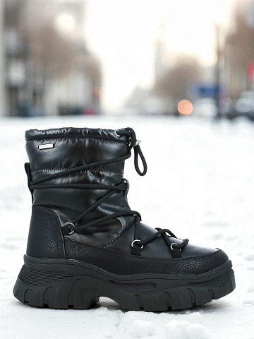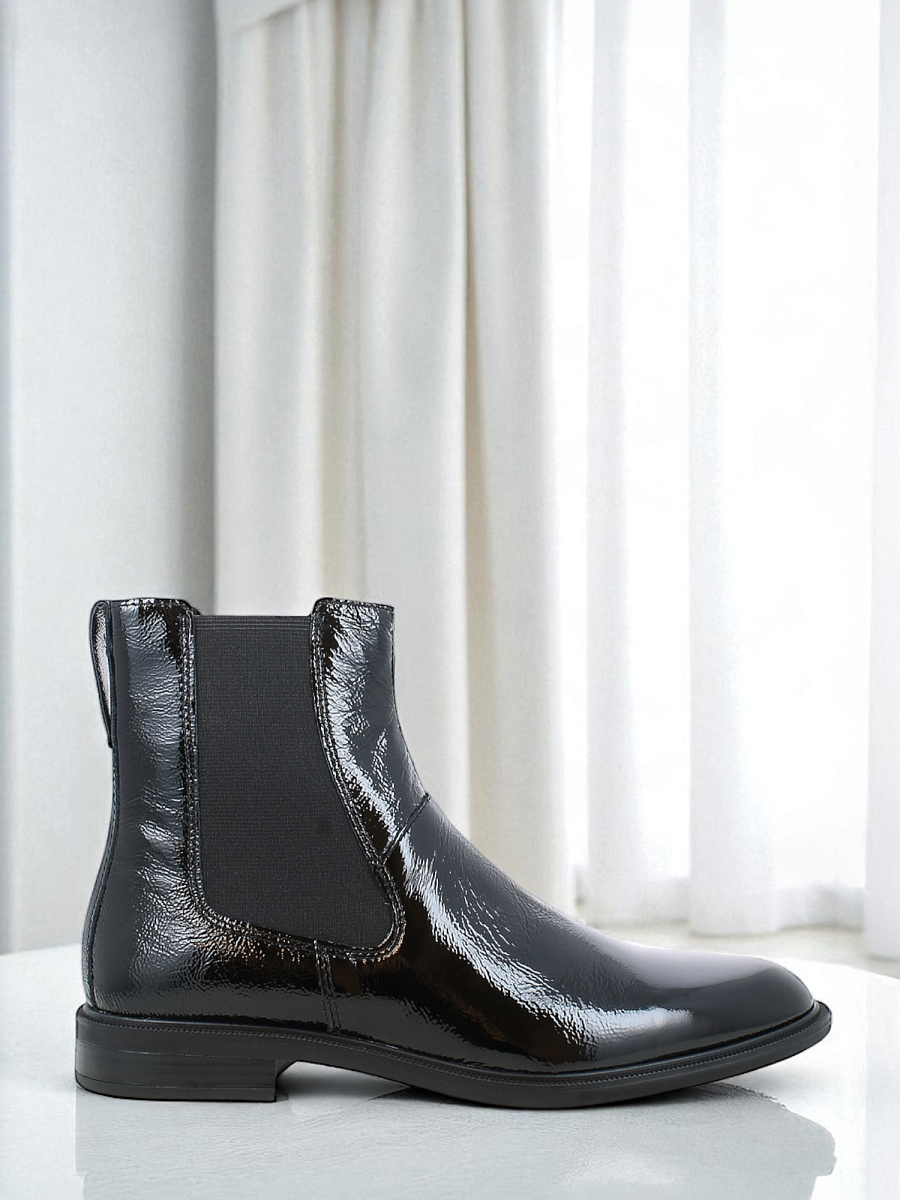 Frances er Chelsea-bootsen med et oppdatert utseende. Modellen er laget i svart, polert skinn med spiss tå, elastiske sidepaneler og draflik bak. Lav hæl som måles til 29 mm.