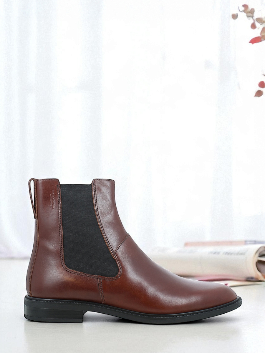 Frances er en tidløs Chelsea-boot og et must-have til skosapet. Modellen er laget i brunt skinn med spiss tå, elastiske paneler på sidene og draflik bak. Lav hæl som måles til 29 mm.