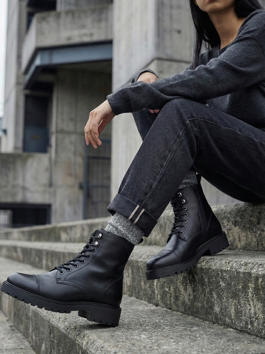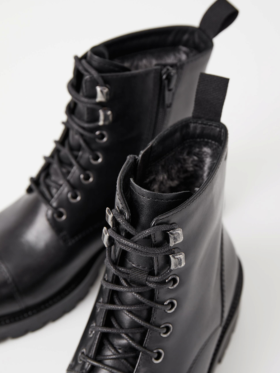 Vagabond Kenova er en stilfull og moderne snøreboots med et chunky uttrykk, perfekt for kalde dager. Modellen er laget i sort glatt skinn og har varmende fôr som holder føttene komfortable i vinterhalvåret. Den kombinerer klassisk snøring med glidelås på innsiden for enkel av- og påkledning, og en solid yttersåle med 40 mm hælhøyde som gir både høyde og stabilitet. Diskré drahempe bak gjør det enklere å ta på skoen, samtidig som den gir et moderne preg.