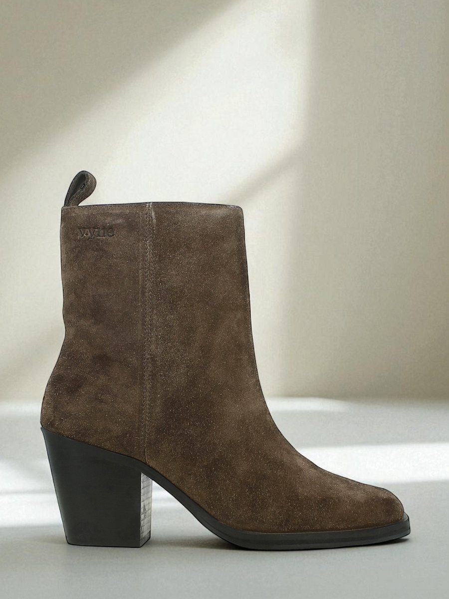 En sofistikert og eksklusiv ankelboots fra Vyne, laget i solid og slitesterkt semsket skinn fra storfe. Den dype bruntonen gir et elegant uttrykk som passer både til hverdags og mer oppkledde anledninger. Modellen har et rent og moderne design med en markant hæl som gir en feminin silhuett og samtidig stabilitet. Den praktiske glidelåsen på innsiden gjør det enkelt å ta bootsen av og på, mens den kraftige yttersålen sørger for godt grep og lang holdbarhet.