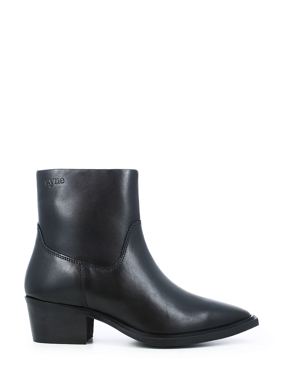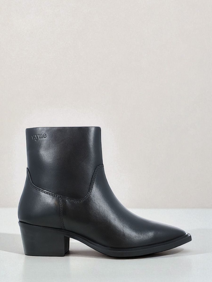 En elegant ankelboots fra Vyne, laget i glatt og slitesterkt kuskinn fra storfe fra Sør-Amerika. Den dype sorte tonen gir et sofistikert og tidløst uttrykk som passer både til hverdags og mer pyntede antrekk. Bootsen har en spiss tå og middels høy hæl som fremhever et feminint og balansert design. Den praktiske glidelåsen på innsiden gjør det enkelt å ta skoen av og på, mens den solide yttersålen sikrer lang levetid og stabilitet.