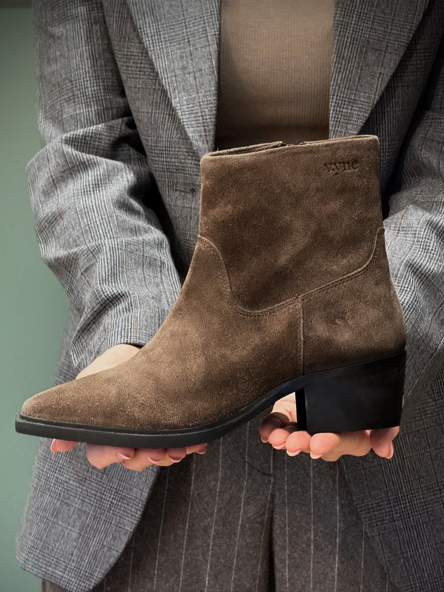 En elegant western boots fra Vyne, laget i slitesterkt semsket skinn fra storfe. Den dype bruntonen gir et raffinert uttrykk som enkelt kan styles til både jeans og kjoler. Bootsen har en spiss tå og middels høy hæl som fremhever et feminint, tidløst design. Den praktiske glidelåsen på innsiden gjør det lett å ta skoen av og på, mens den solide yttersålen sikrer lang levetid.