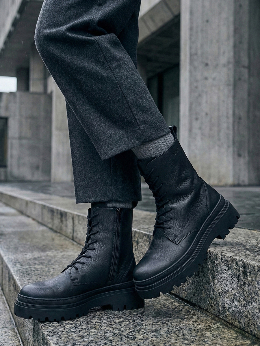 En eksklusiv boots i sort, laget av solid og slitesterkt skinn fra storfe i Sør-Amerika. Bootsen kombinerer tidløs stil med moderne funksjonalitet og høy komfort. De håndlagde sålene fra Italia gir godt grep og et raffinert uttrykk, mens den anatomisk formede innersålen følger fotens naturlige kurver for optimal demping og avlastning ved hvert steg. Modellen har lisser foran og glidelås på innsiden som gjør den enkel å ta av og på, samtidig som passformen blir perfekt. Den kraftige yttersålen gir et markant uttrykk og stabilitet på ulike underlag.
