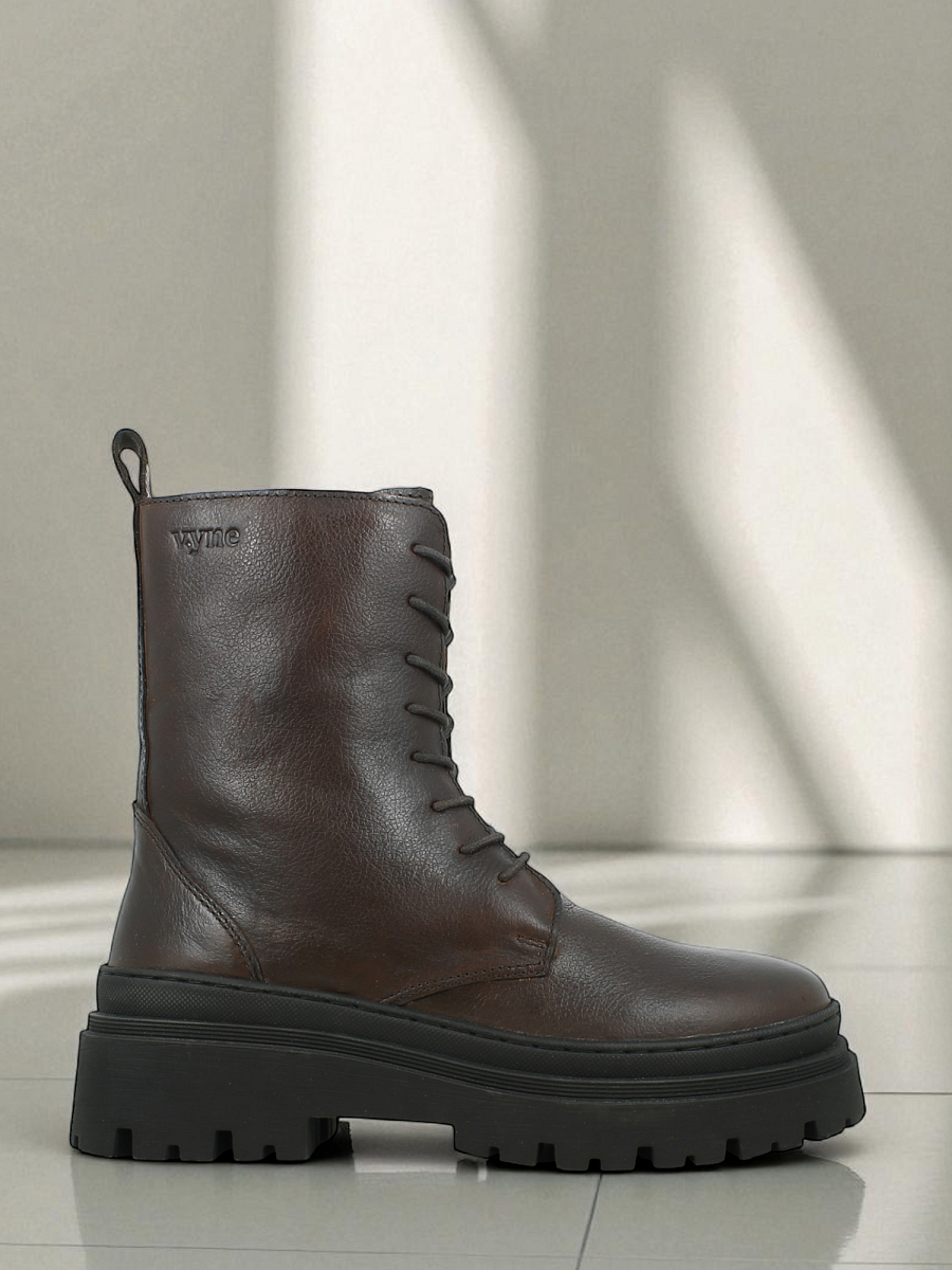 Vyne Matera Leather Boots Dark Brown er en elegant og solid damesko laget i slitesterkt glatt skinn av høy kvalitet. Den mørkebrune fargen gir et tidløst og sofistikert uttrykk som passer perfekt til både hverdagsbruk og penere antrekk. Det glatte skinnet har en naturlig glans og høy motstandsdyktighet mot slitasje, mens den robuste yttersålen i gummi gir stabilitet og godt grep på varierende underlag. Innsiden er foret med mykt tekstilmateriale som gir behagelig komfort, og glidelås på innsiden gjør det enkelt å ta skoen av og på.