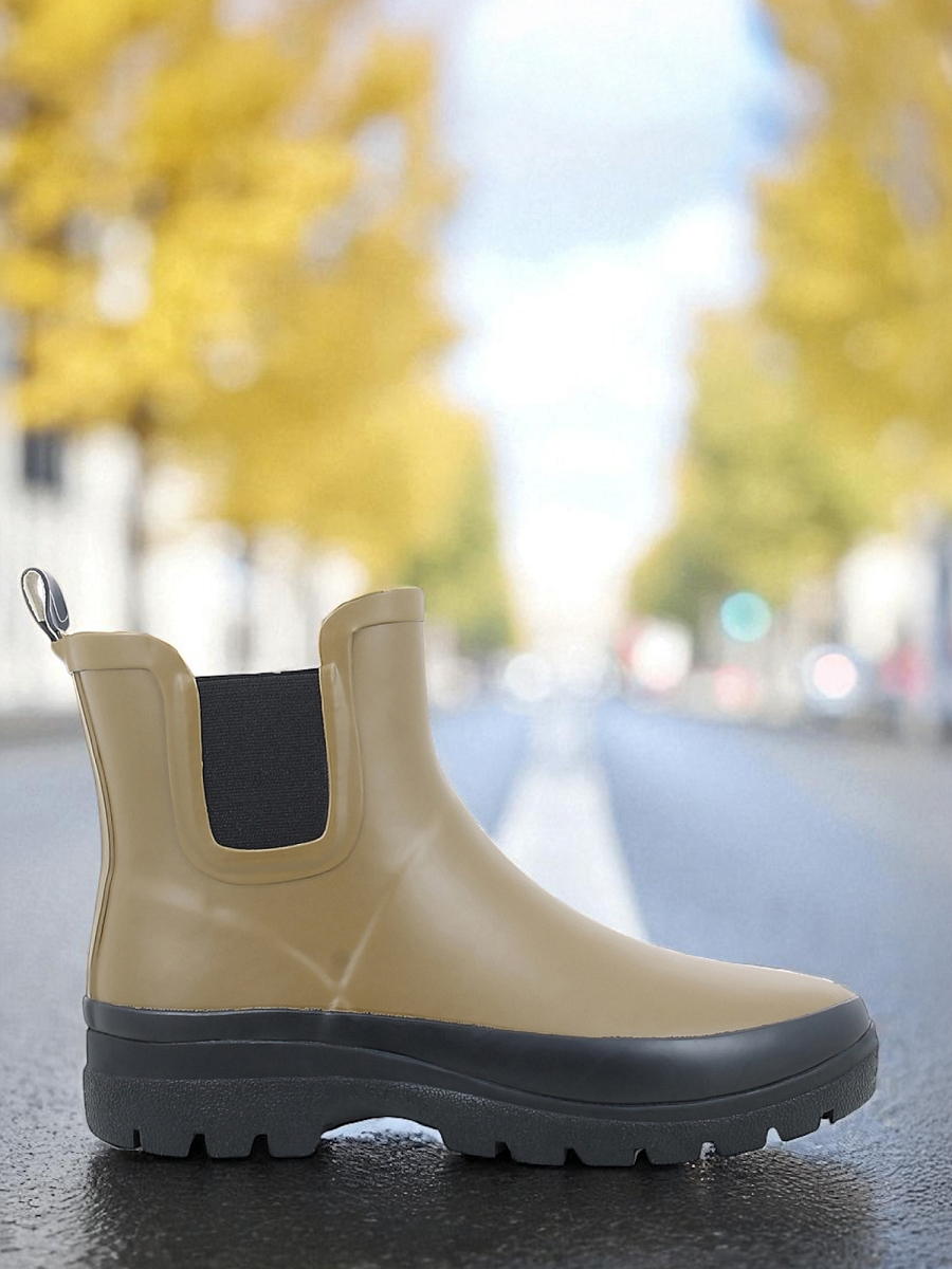Elvira Platform Rain Boot kombinerer moderne design med funksjonell komfort for regnfulle dager. Denne halvhøye gummistøvelen har en elegant silhuett med lett forhøyet platåsåle som gir et trendy uttrykk uten å gå på bekostning av stabilitet. Overdelen er laget av slitesterk, vanntett naturgummi som effektivt holder føttene tørre, mens det myke tekstilfôret på innsiden gir en behagelig følelse gjennom hele dagen. Den strukturerte sålen gir utmerket grep på vått underlag, og den fleksible passformen med drahempe bak gjør støvlene enkle å ta av og på.