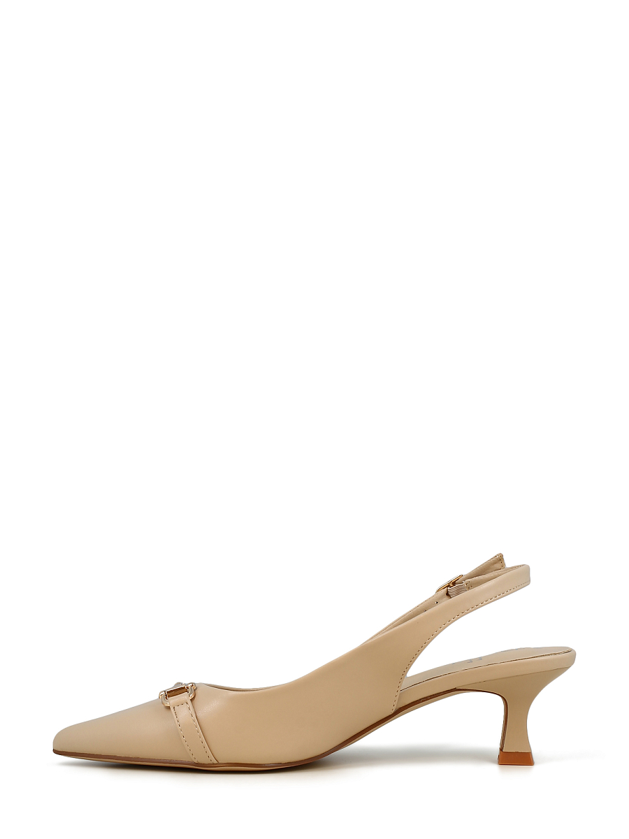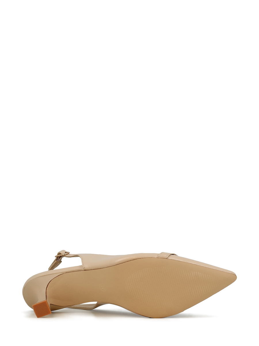 Elegant og moderne slingback-pumps i en delikat nude farge som gir et sofistikert og tidløst uttrykk. Den spisse tåformen bidrar til en feminin og stilren silhuett, mens den åpne hælen med justerbar rem sikrer god passform og komfort gjennom hele dagen. Det dekorative spennet tilfører en eksklusiv detalj som løfter designet på en subtil måte. Den lave og stabile taxihælen på ca. 5 cm gir en behagelig høyde, perfekt til både jobb, hverdagsbruk og mer pyntede anledninger i vår- og sommersesongen. Den glatte overdelen gjør skoen enkel å kombinere med både lyse og mørke antrekk, og den nøytrale fargen gir et elegant og forlengende uttrykk til bena.