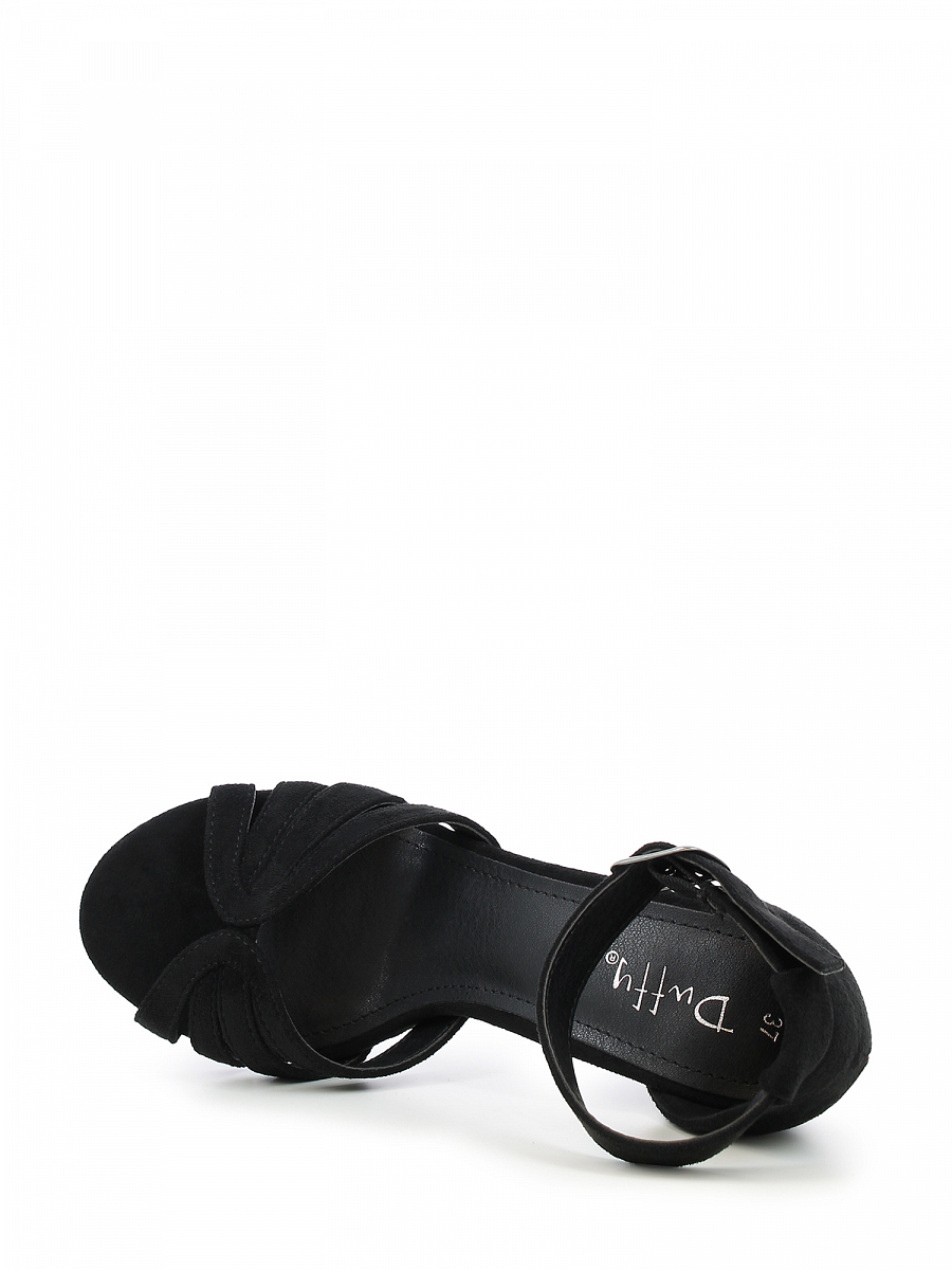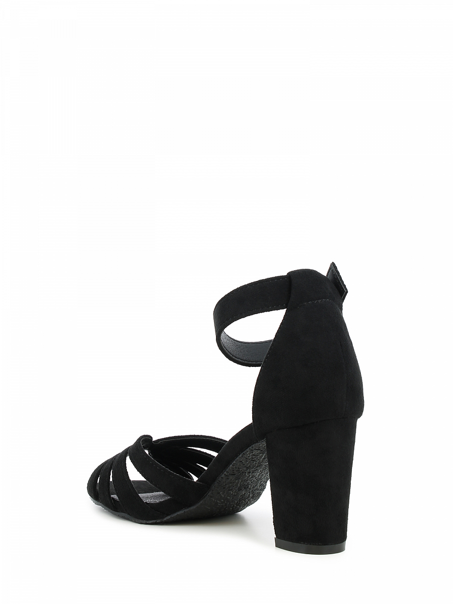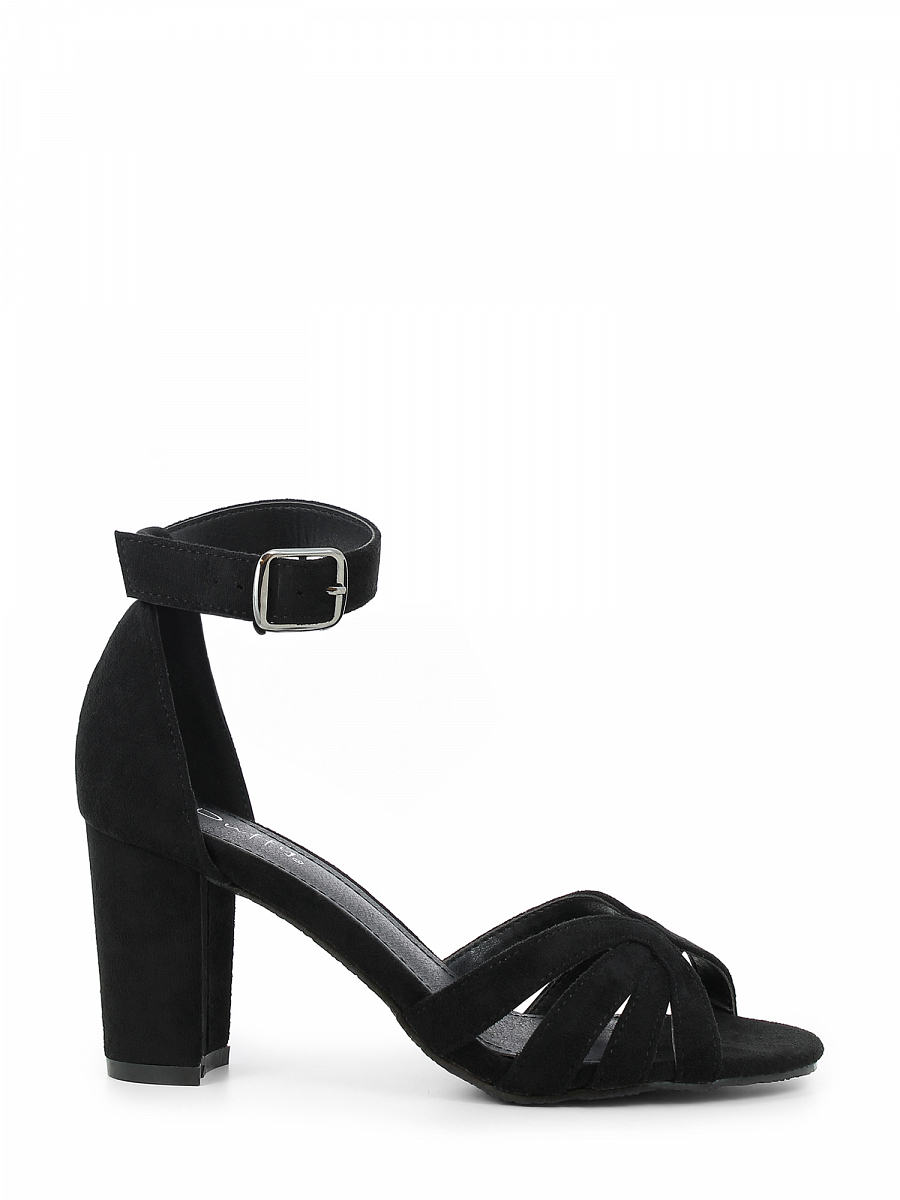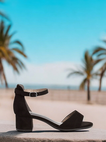 Saprina Black er en elegant sandal designet for fest, hverdag og alle anledninger der du ønsker et sofistikert uttrykk. Modellen har en lukket hælkappe og en justerbar ankelstropp som gir stabilitet og god passform. Overdelen er laget i semsket skinnimitasjon med kryssede, dekorative stropper foran som skaper et lekkert og feminint uttrykk. Den solide blokkhælen på 7,5 cm gir en balansert høyde som er behagelig å gå med, samtidig som den løfter stilen.