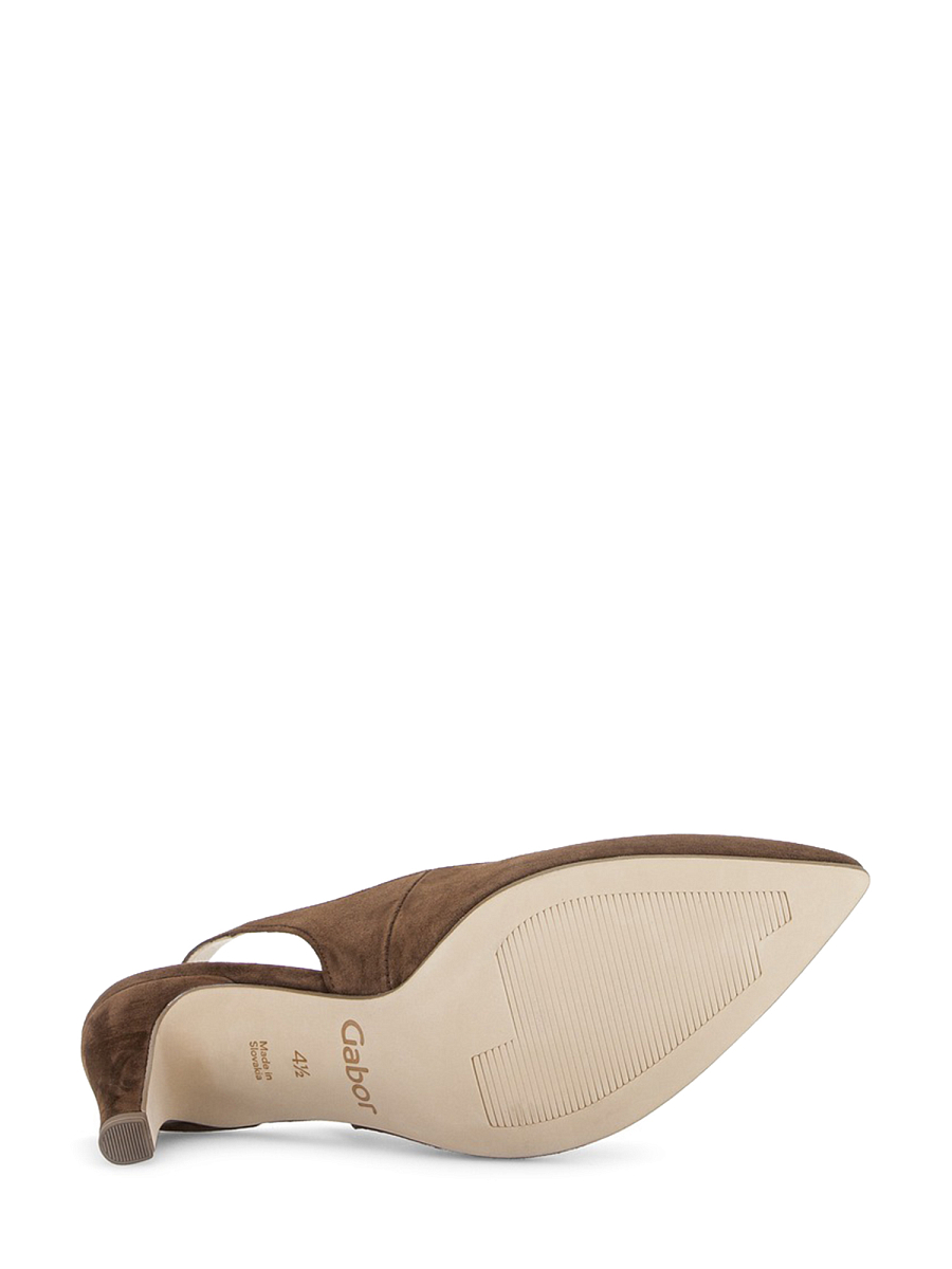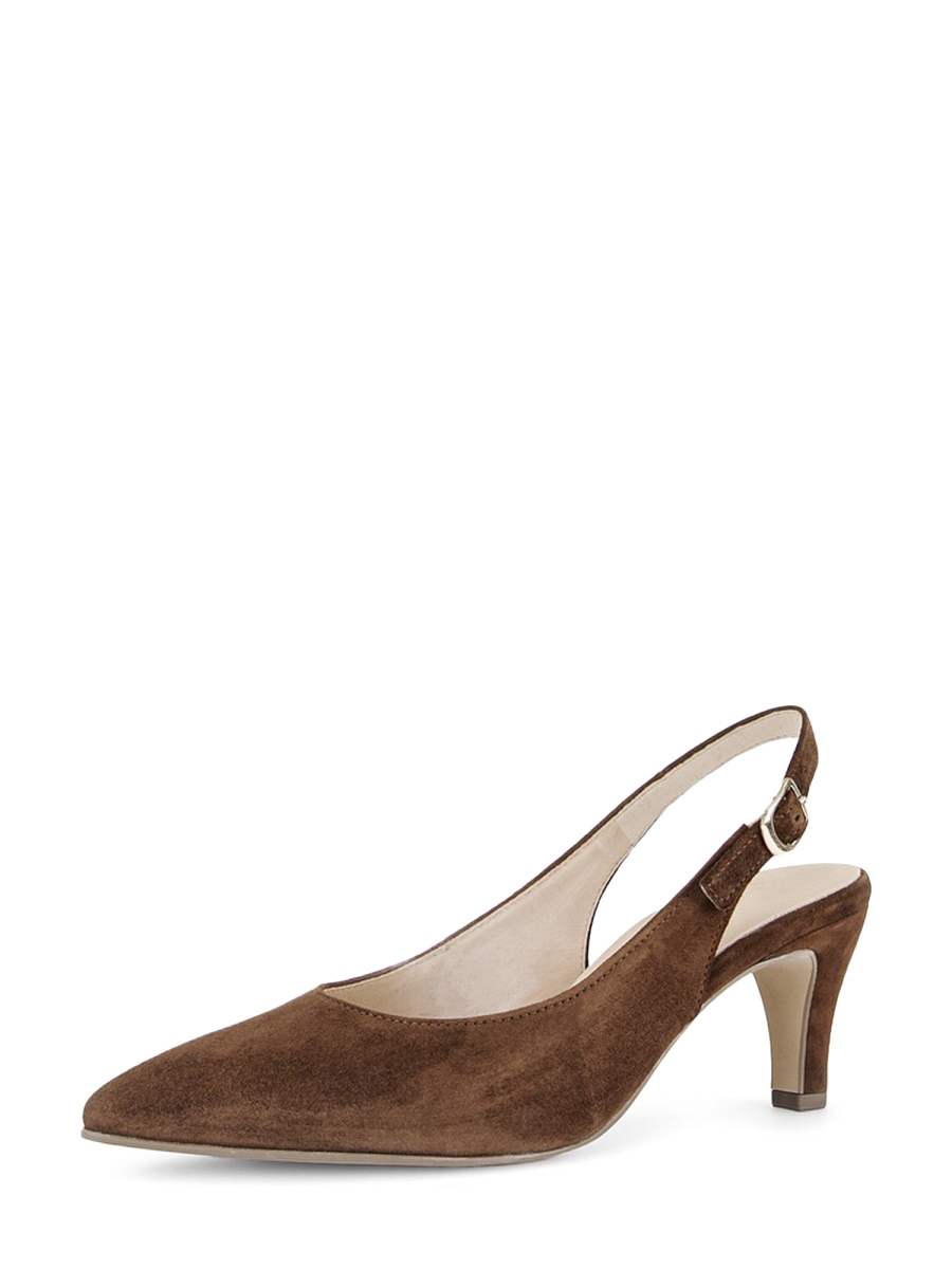 Elegant og feminin slingback fra Gabor i mykt semsket skinn. Den spisse tåen gir et stilrent og stilrent uttrykk, mens den stabile trakthælen på 7 cm gir en god balanse mellom høyde og komfort. Den justerbare hælremmen med spenne sørger for god passform og gjør skoen enkel å tilpasse foten. Den varme brune fargen gjør modellen svært anvendelig og lett å kombinere med både kjoler, skjørt, dressbukser og jeans, enten det er til jobb, selskap eller hverdagsbruk. Innsiden er fôret med lær som gir god pusteevne og komfort gjennom dagen.