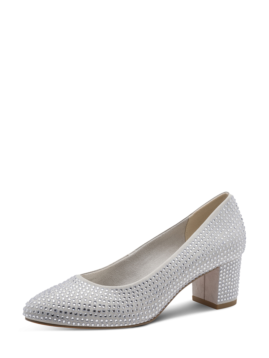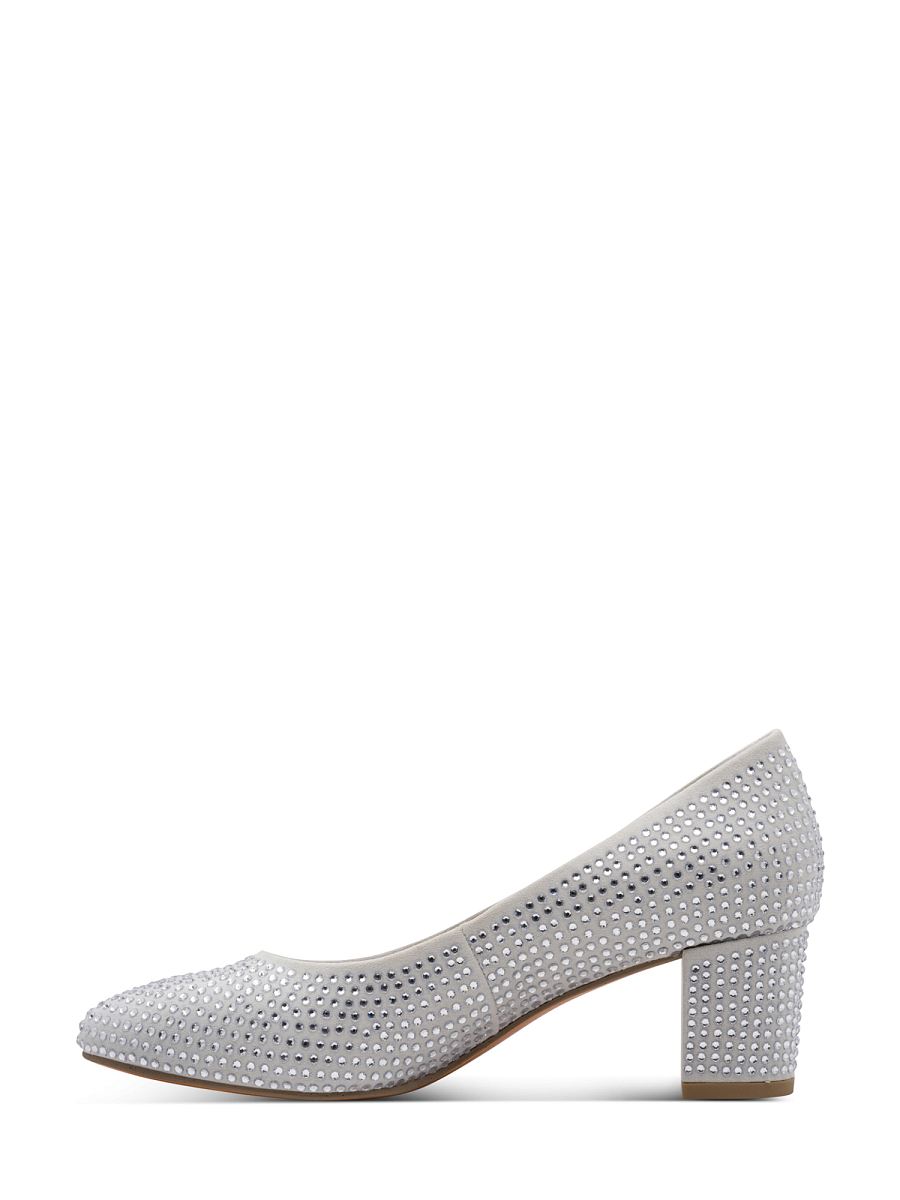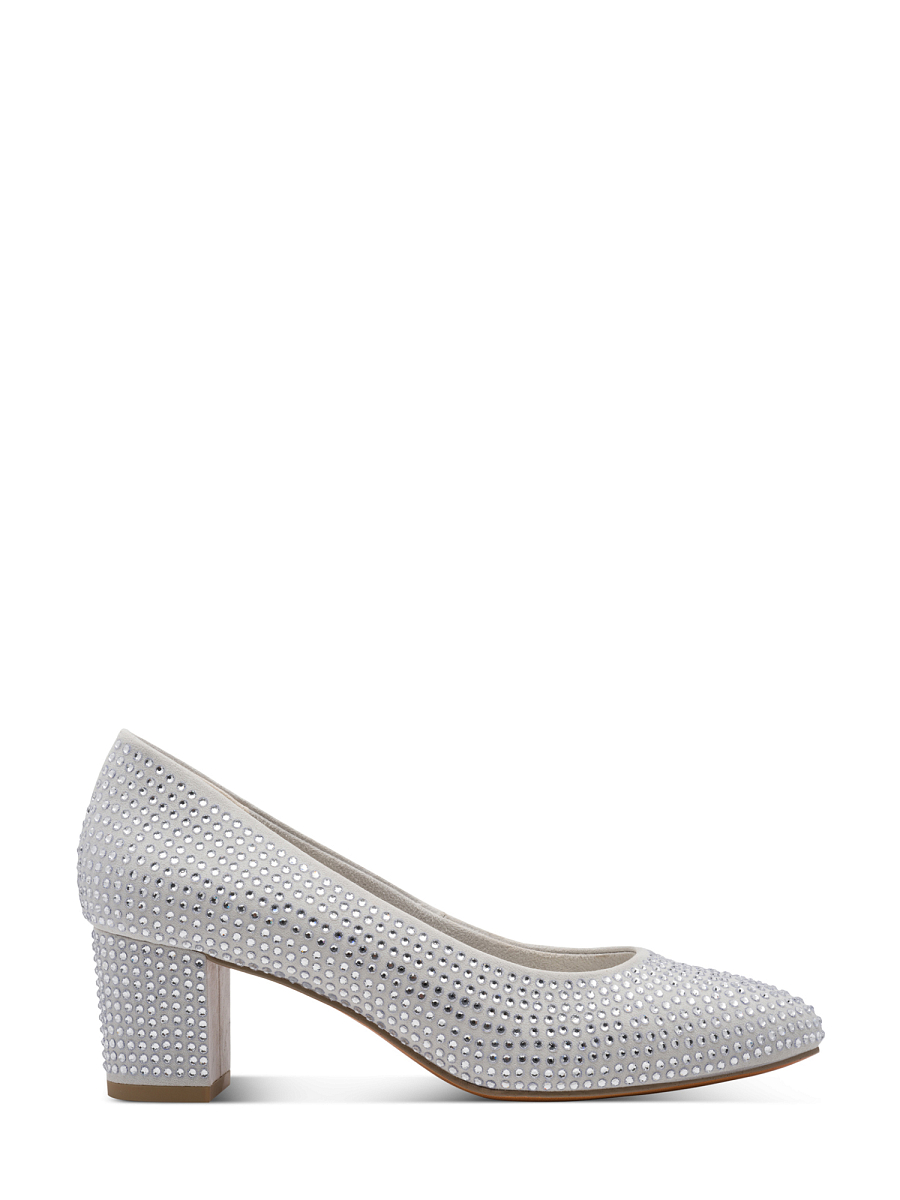 Marco Tozzi Lirena Silver White er elegante pumps som kombinerer et sofistikert uttrykk med komfort du faktisk kan stole på. Den feminine silhuetten løftes av en stabil blokkhæl som gir et pent og balansert steg, samtidig som den gjør skoen behagelig å bruke over lengre tid. Overdelen i slitesterkt tekstil er dekorert med diskrete, glitrende detaljer i Silver White som gir et eksklusivt preg og gjør modellen perfekt til både festlige anledninger og penere hverdagsbruk.