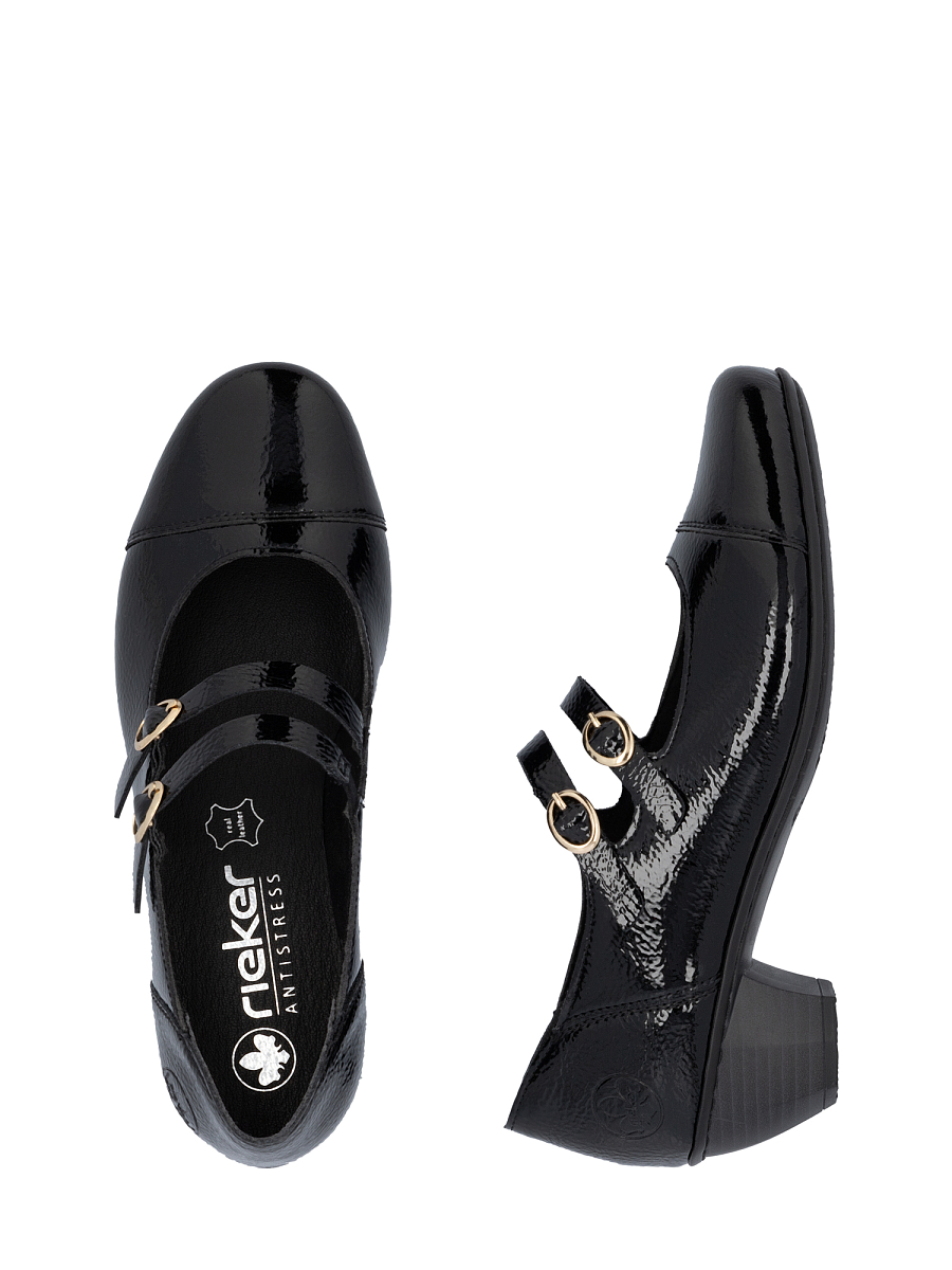 Rieker Maribel kombinerer klassisk eleganse med en moderne passform som gjør den perfekt til både jobb og fest. Den glansfulle overflaten i sort lakkskinn gir et raffinert uttrykk, mens de doble remmene med metallspenner tilfører et feminint preg. Den stabile blokkhælen gir støtte og balanse, og den lette, støtdempende sålen med Antistress-teknologi sørger for maksimal komfort gjennom hele dagen. Den myke innersålen former seg etter foten og bidrar til en behagelig følelse, selv ved langvarig bruk.