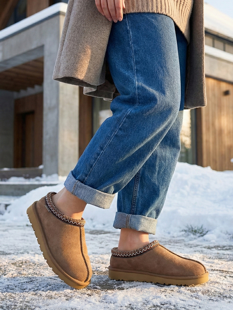 Med en overdel i høykvalitets semsket skinn gir tøffelen et luksuriøst utseende og en slitesterk finish. Kantdetaljer med dekorative sømmer gir et unikt og moderne preg, mens det myke fôret i ull eller ullblanding sikrer at føttene dine holder seg varme, selv på de kaldeste dagene.