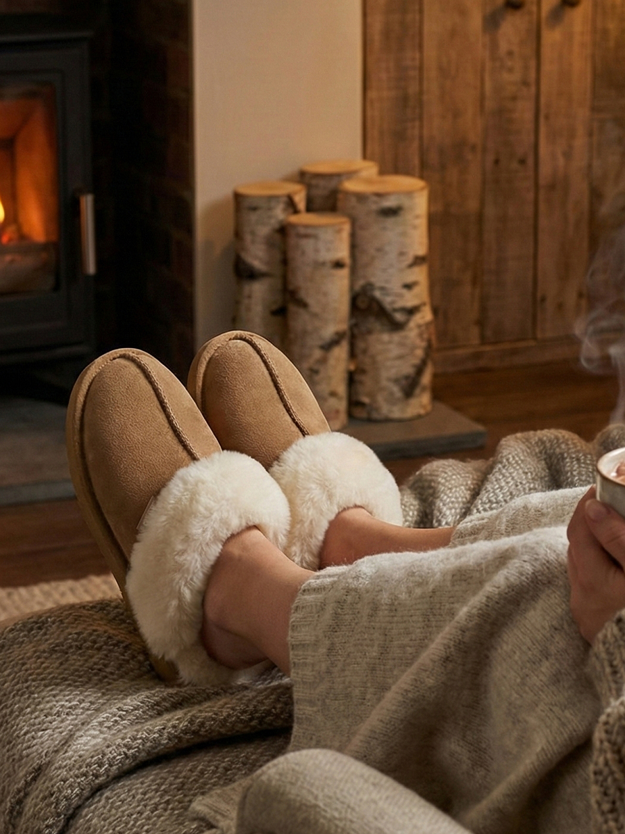 Designet har et moderne, feminint preg med rene linjer og subtile sømdetaljer som gir et luksuriøst uttrykk. Doubleface-materialet gjør at innsiden former seg naturlig rundt foten og gir en behagelig, jevn varme selv på de kaldeste dagene. Den dempede innersålen gir støtte og komfort gjennom hele dagen, mens den lette og fleksible yttersålen gjør tøffelen perfekt både innendørs og for korte turer ut.