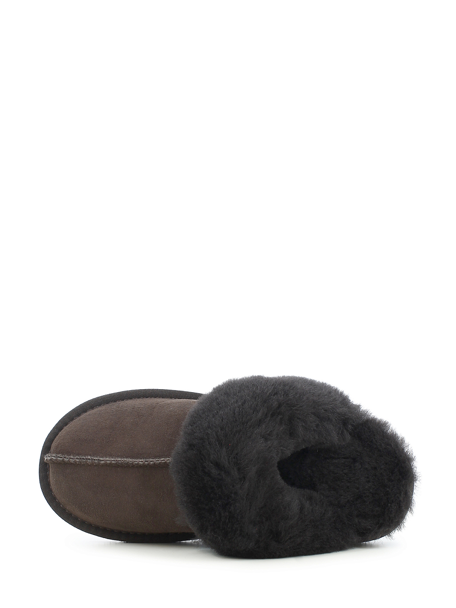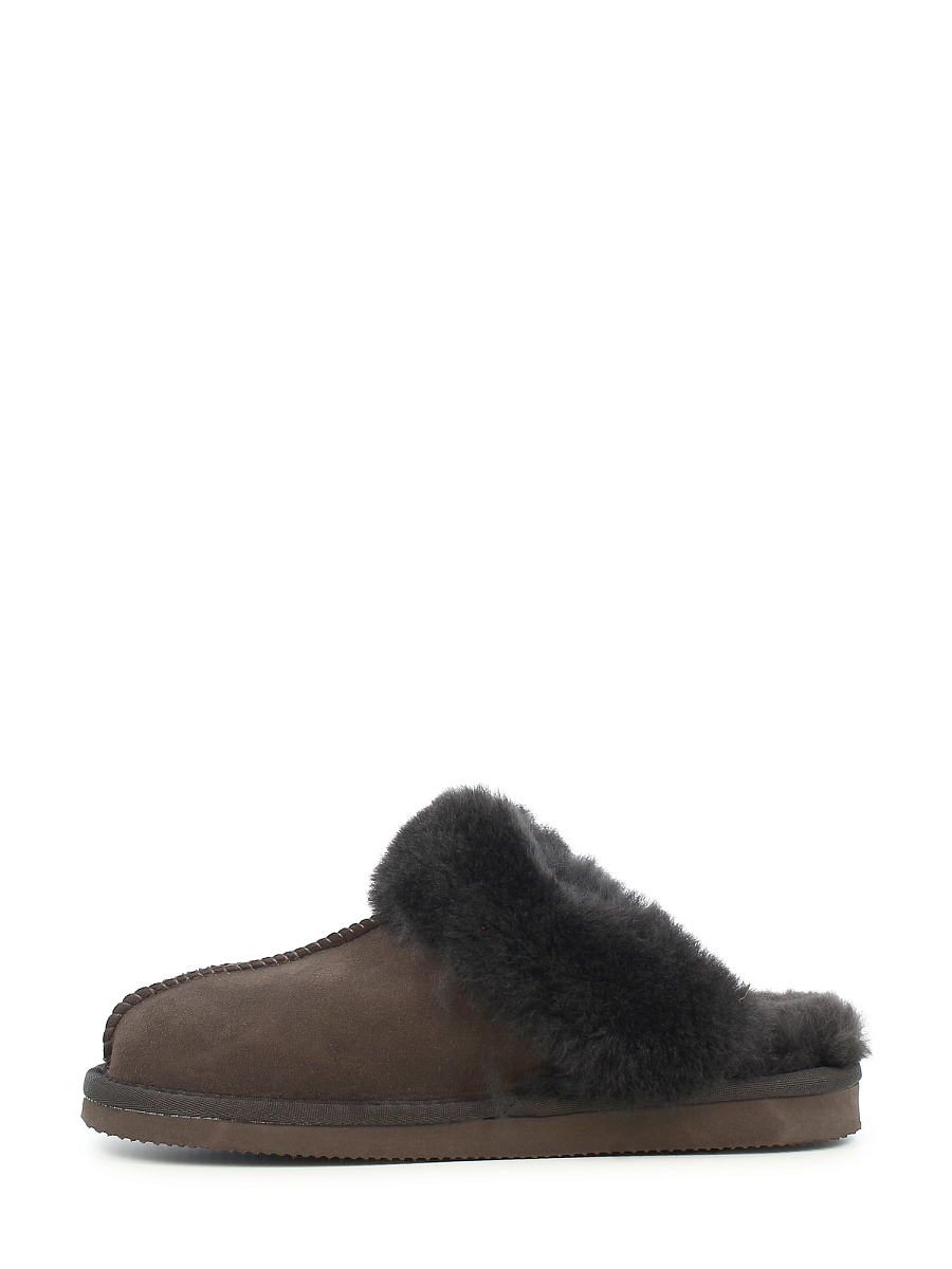 Denne eksklusive tøffelen fra FootHuggers kombinerer varme, komfort og stil på elegant vis. Modellen er utført i brunt semsket skinn med mykt ullfôr i mørk tone som gir et luksuriøst preg. Perfekt for avslappende dager hjemme, på hytta eller på terrassen.