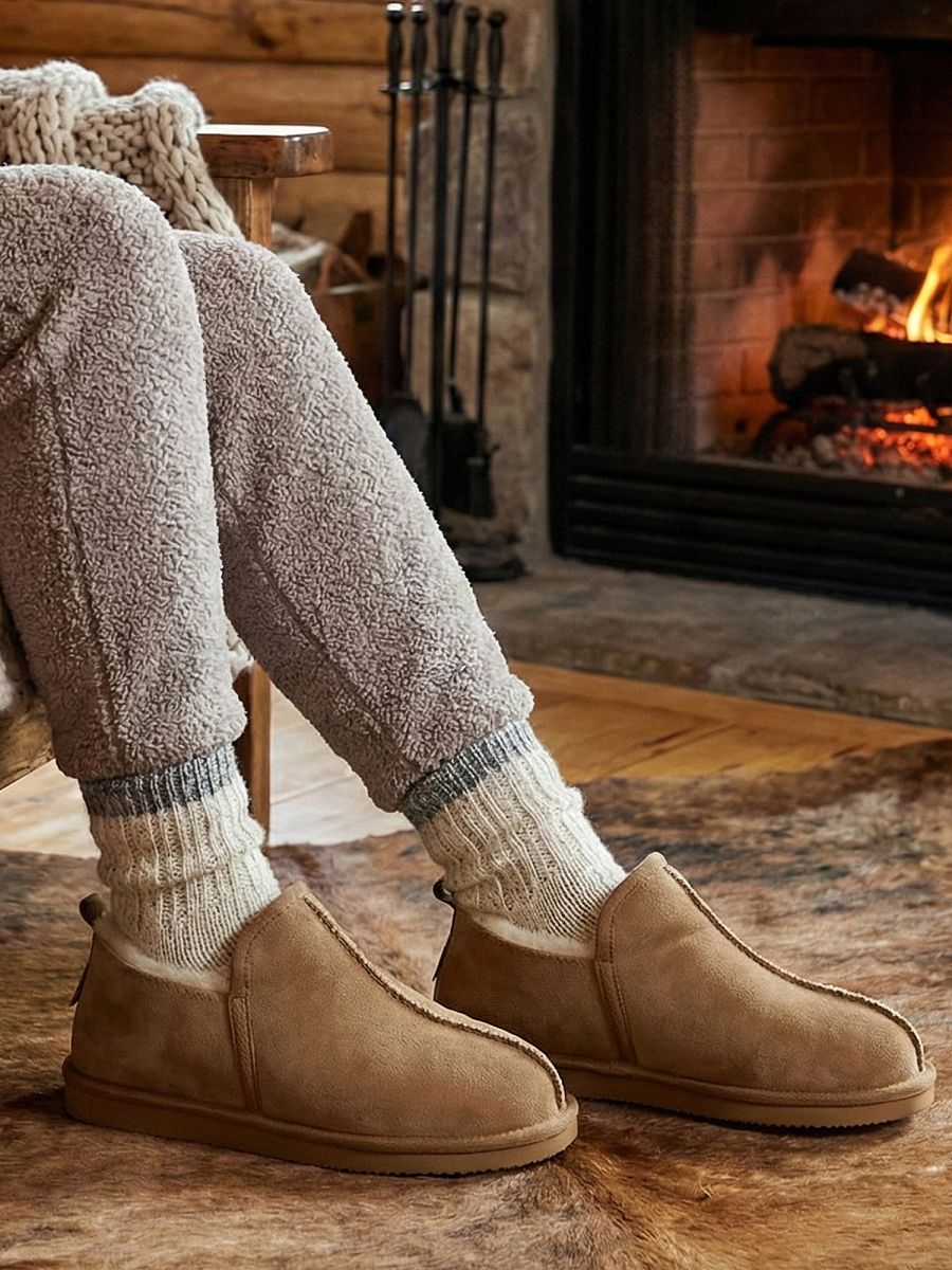 FootHuggers Serenity Suede Tøffel – Doubleface Sheepskin for myk luksus og naturlig varme