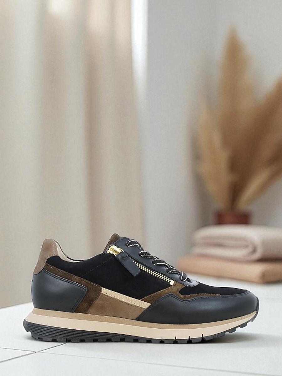 Opplev stil og komfort i Gabor 56.378.67 Hollywell joggesko i Black Whisky. Disse lave joggeskoene fra Gabor Comfort-serien er snøret, med lett på/av ytre glidelås, klosset PU-såleenhet og uttakbare innleggssåler, naturlig velt, volum i vrist og fotball, bevegelsesfrihet for tærne, en bredere trådområde, og ekstra lett og fleksibilitet for en bred H-bredde passform. Komplett med en iøynefallende fargekodet hælteller.