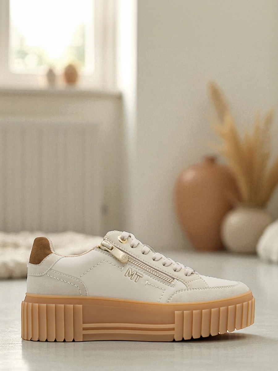 Marco Tozzi Livia LaceZip er en moderne sneakers i beige som kombinerer moteriktig design med praktisk funksjonalitet. Den kraftige sålen på 40 mm gir både høyde og støtte, mens den myke innersålen og tekstilfôret sørger for komfort hele dagen. Overdelen består av en stilfull blanding av tekstil og syntetisk materiale, og detaljene i gullfarget glidelås og logo gir skoen et raffinert uttrykk. Den runde tåformen og F-bredden passer godt til de fleste føtter, og med avtakbar fotseng kan du enkelt bytte til egne innleggssåler. Snøring kombinert med glidelås gjør det raskt å ta skoen av og på samtidig som passformen holdes optimal.