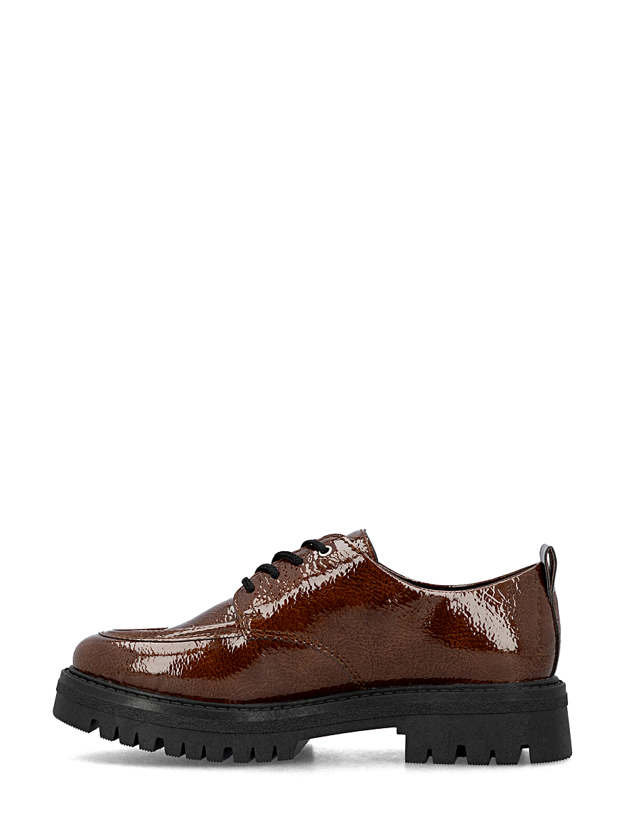 Rieker Patent Platform Derbie kombinerer et elegant uttrykk med moderne detaljer i en sko som skiller seg ut. Overdelen har et blankt, patentlignende syntetisk materiale i en varm brun tone som gir et eksklusivt preg. Den høyere plattformsålen med strukturert mønster gir et trendy og robust uttrykk, samtidig som den bidrar til stabilitet og komfort gjennom dagen. Snøringen sørger for god passform, mens den myke innersålen med skinn og tekstilfôr gir ekstra behagelig støtte for foten.