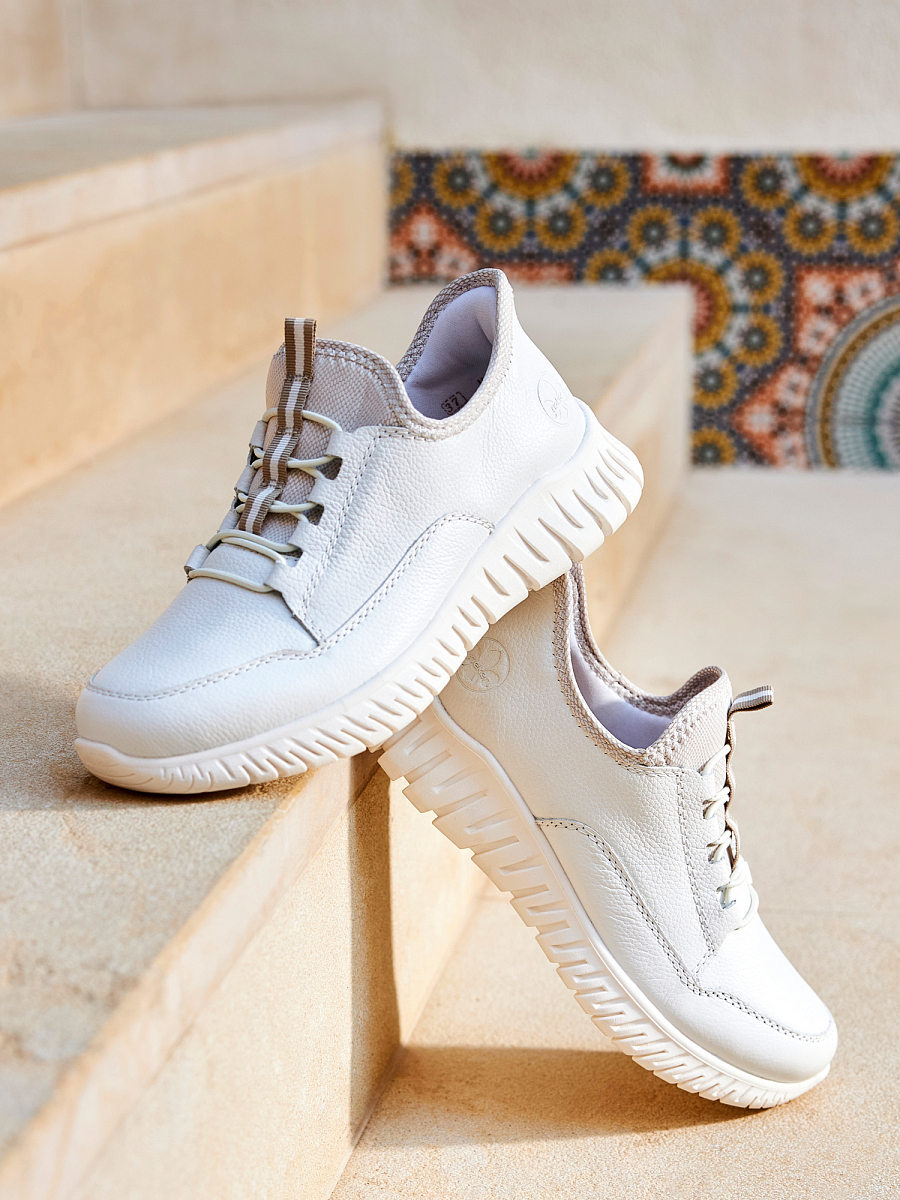 Oppdag Rieker White Ready2Go Slip-on, en allsidig sneaker designet for kvinner som verdsetter både stil og komfort. Disse skoene kombinerer Riekers anerkjente Antistress-teknologi, som gir letthet, fleksibilitet og effektiv støtdemping, med et moderne og praktisk slip-on-design. Perfekte for vår, sommer og høst, når du trenger en komfortabel og stilren sko til hverdagsbruk.