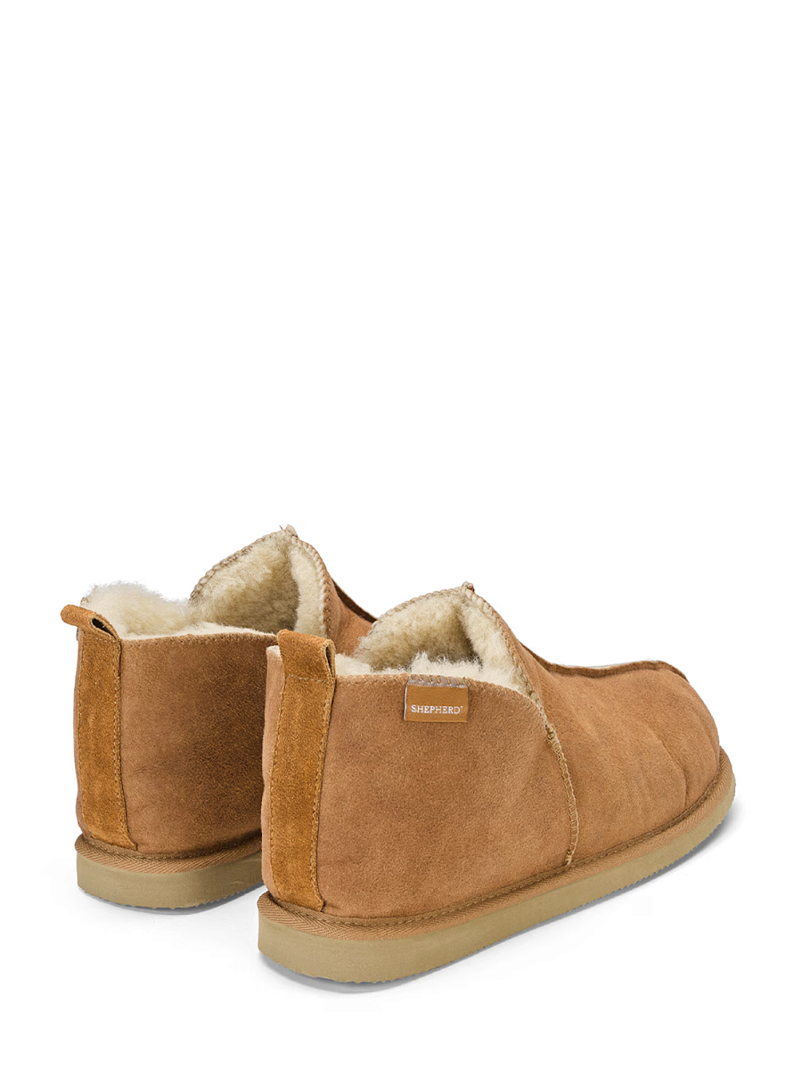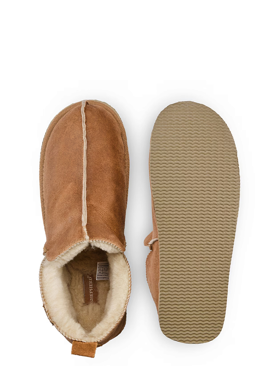 Shepherd Annie er en klassisk ankelhøy dametøffel i ekte saueskinn, utviklet for deg som ønsker både varme og komfort med et tidløst uttrykk. Det pustende saueskinnsfôret holder føttene naturlig varme uten å bli klamme, mens utsiden i samme kvalitetsmateriale gir et elegant og solid preg. Dekorative sømmer og tekstilkant langs avslutningene gir modellen et gjennomført design, og en praktisk hempe i semsket skinn gjør det enkelt å ta tøflene på og av. Den lette EVA-yttersålen sørger for myk demping og behagelig bruk gjennom hele dagen, noe som gjør denne modellen til en favoritt sesong etter sesong.