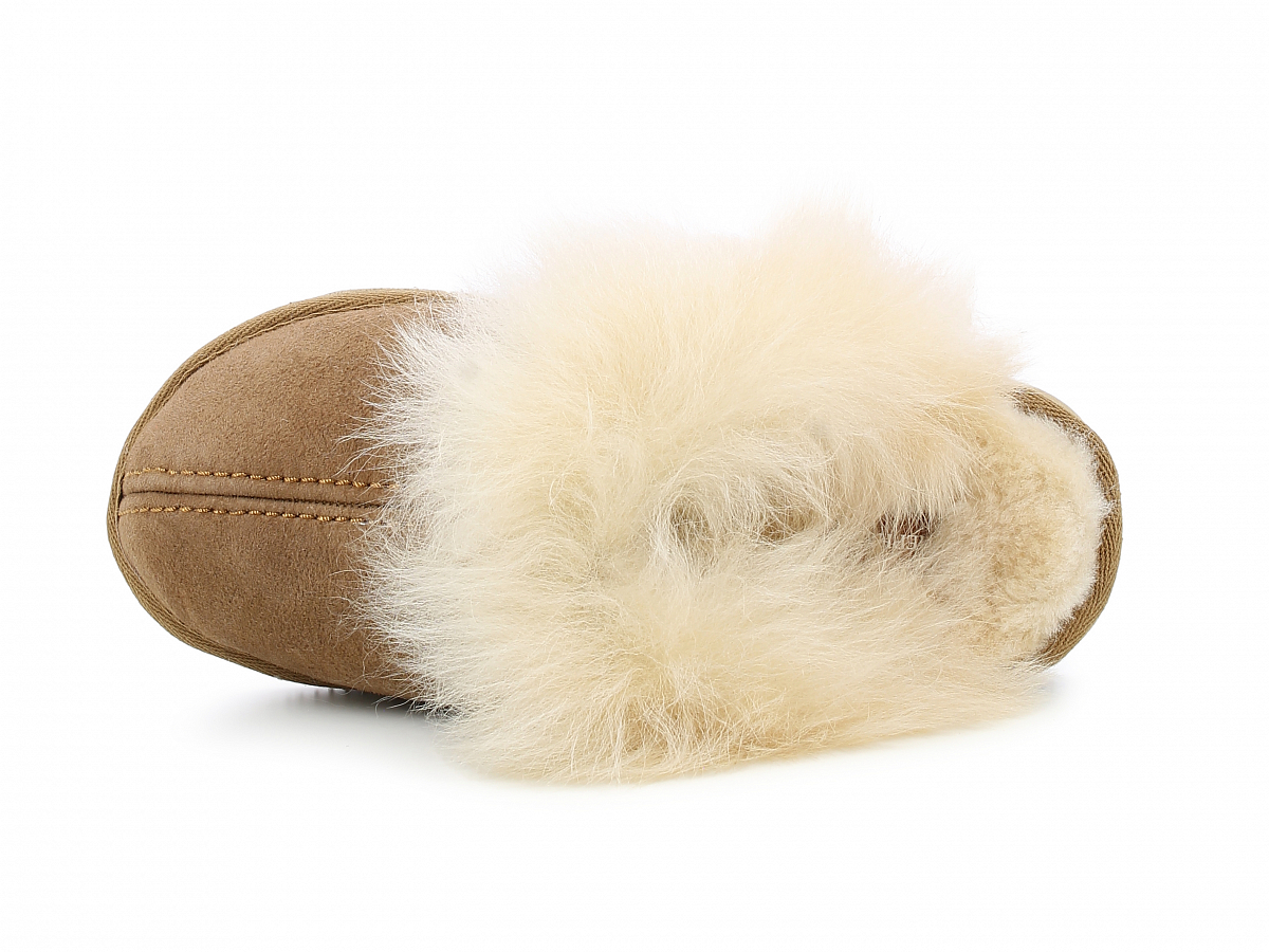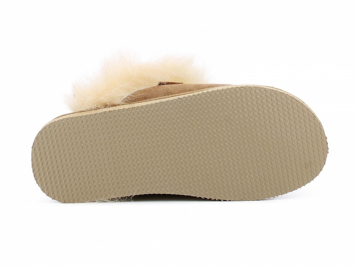 Shepherd Evelina. Myke og varmende tøfler i saueskinn. Slip-in-modell med bred kant i langhåret saueskinn. Utenpåliggende søm foran. Kantebånd i tekstil rundt sålen. Yttersåle i EVA.
